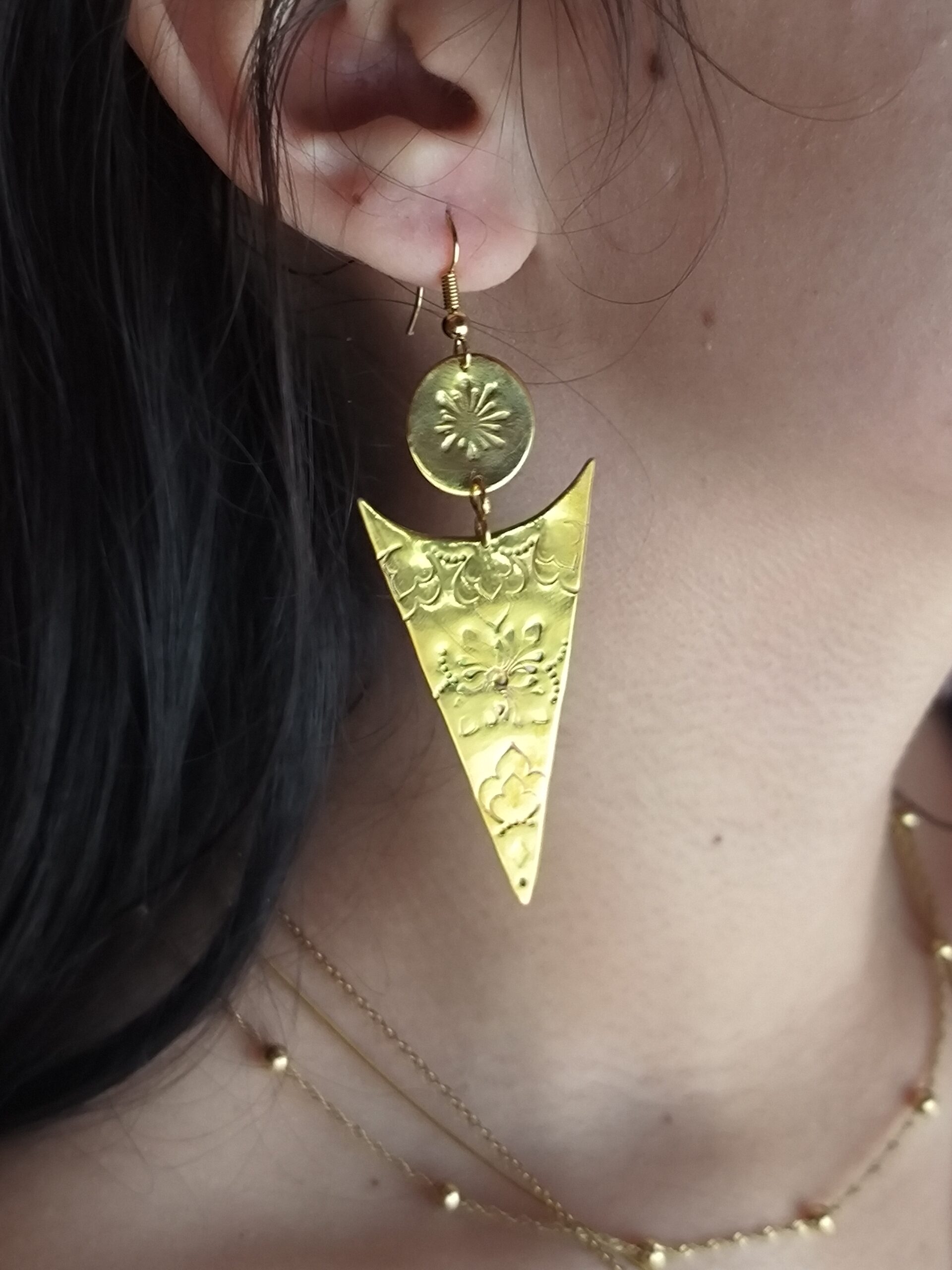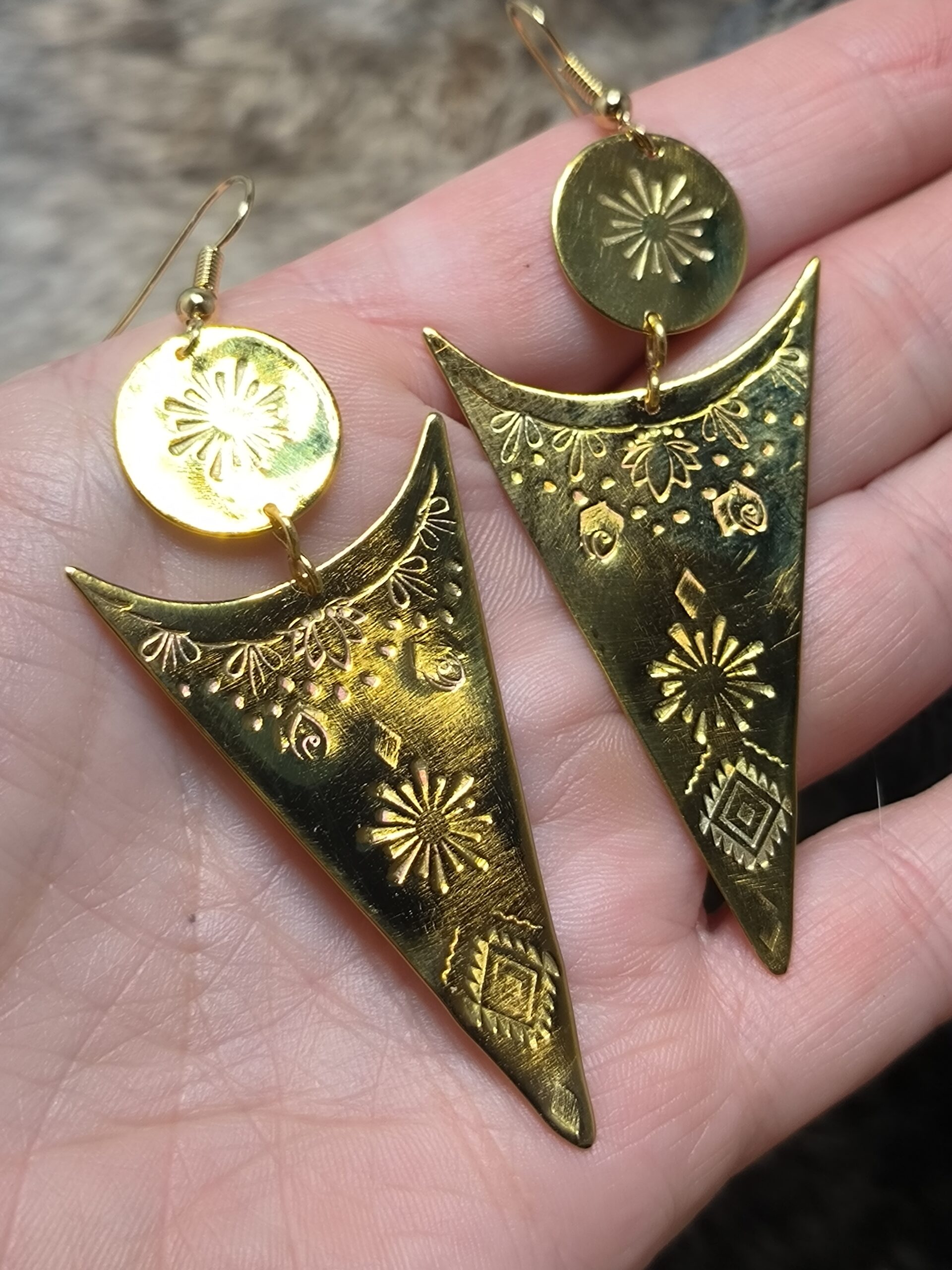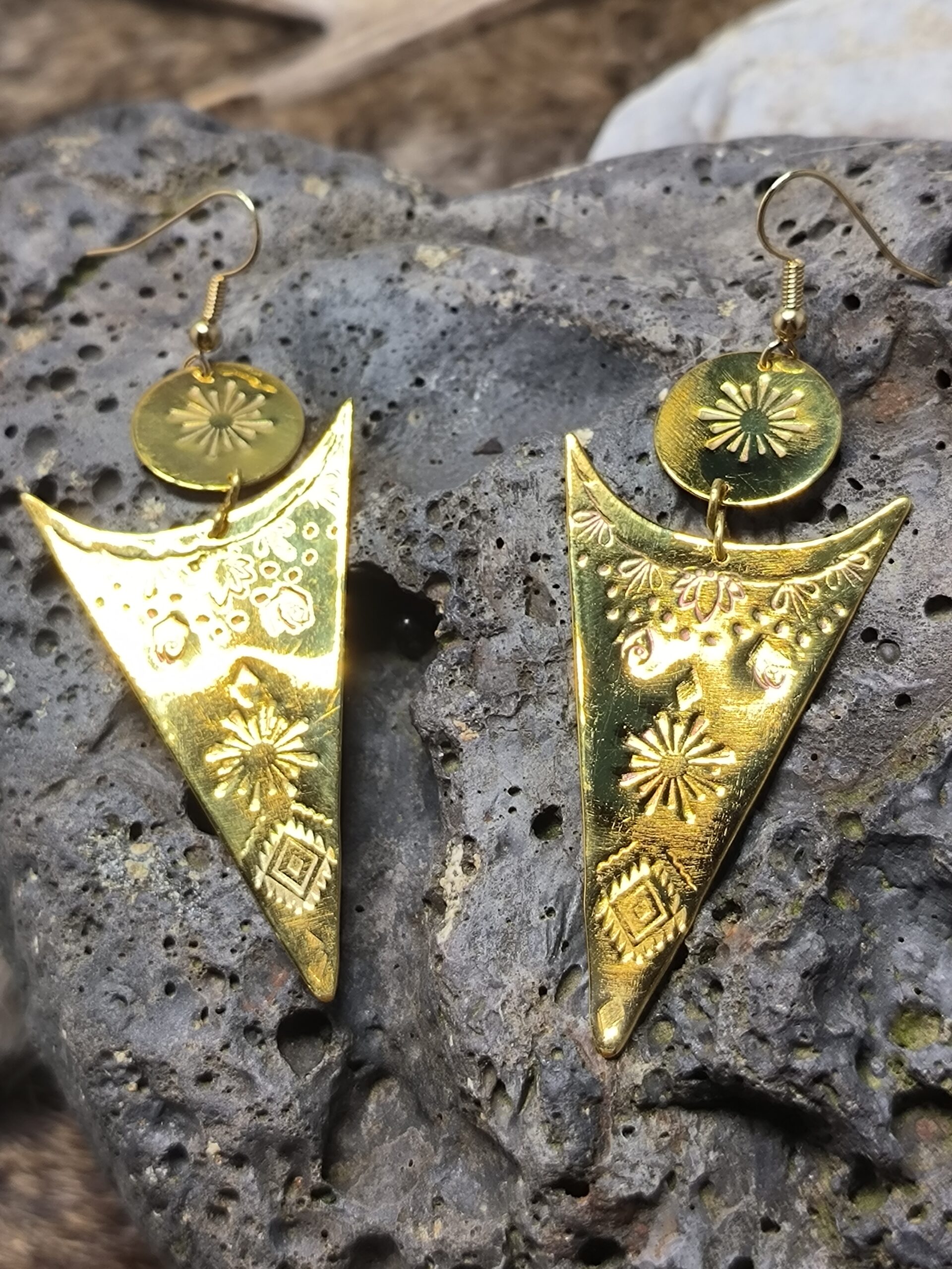Affirmez votre lumière intérieure avec ces boucles d’oreilles en laiton doré gravé, inspirées des symboles solaires et sacrés.
