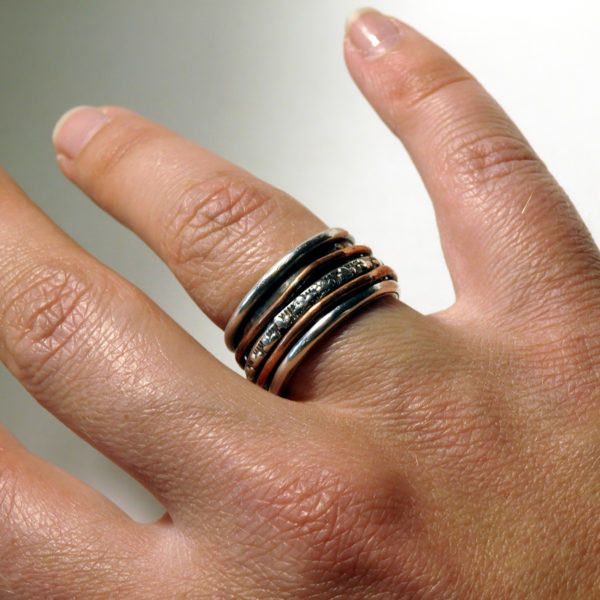 Une bague imposante, moderne et originale, texturée avec des fils d’argent fins et des boules d’argent.