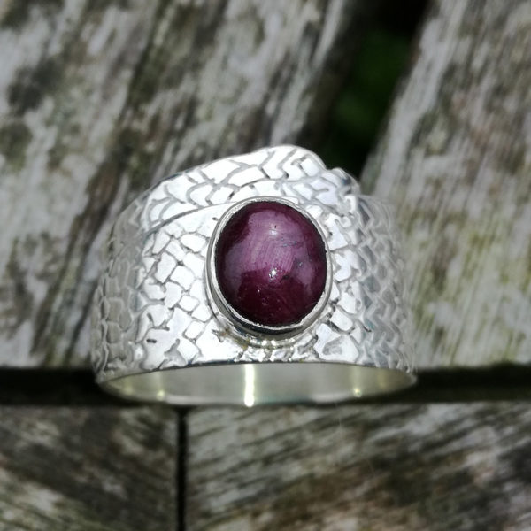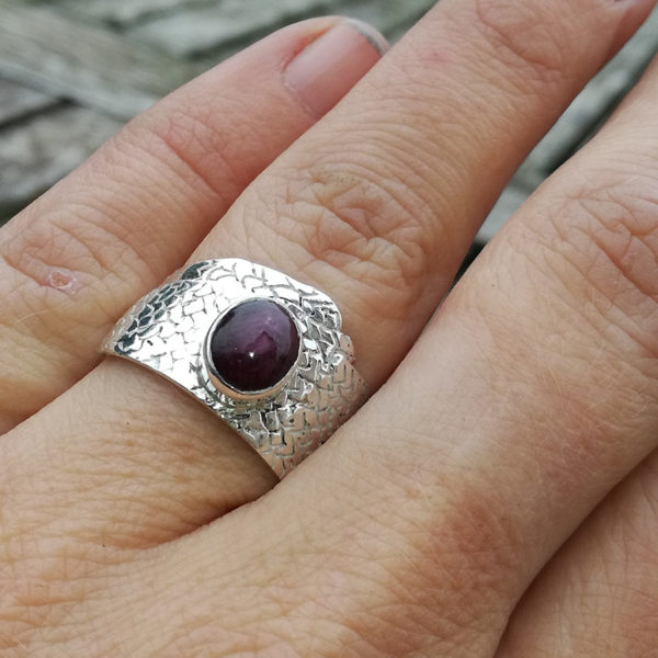 Cette superbe bague est ornée d’une magnifique opale noire de forme triangulaire aux multiples reflets verts tels des paillettes qui illuminent la pierre. L’opale est sertie au milieu d’un entrelas de fil d’argent tels des branchages pour un côté design.