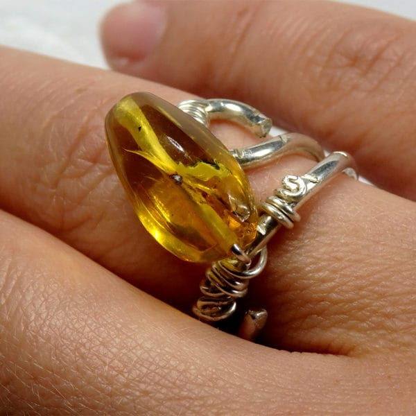 Cette superbe bague est ornée d’une magnifique opale noire de forme triangulaire aux multiples reflets verts tels des paillettes qui illuminent la pierre. L’opale est sertie au milieu d’un entrelas de fil d’argent tels des branchages pour un côté design.