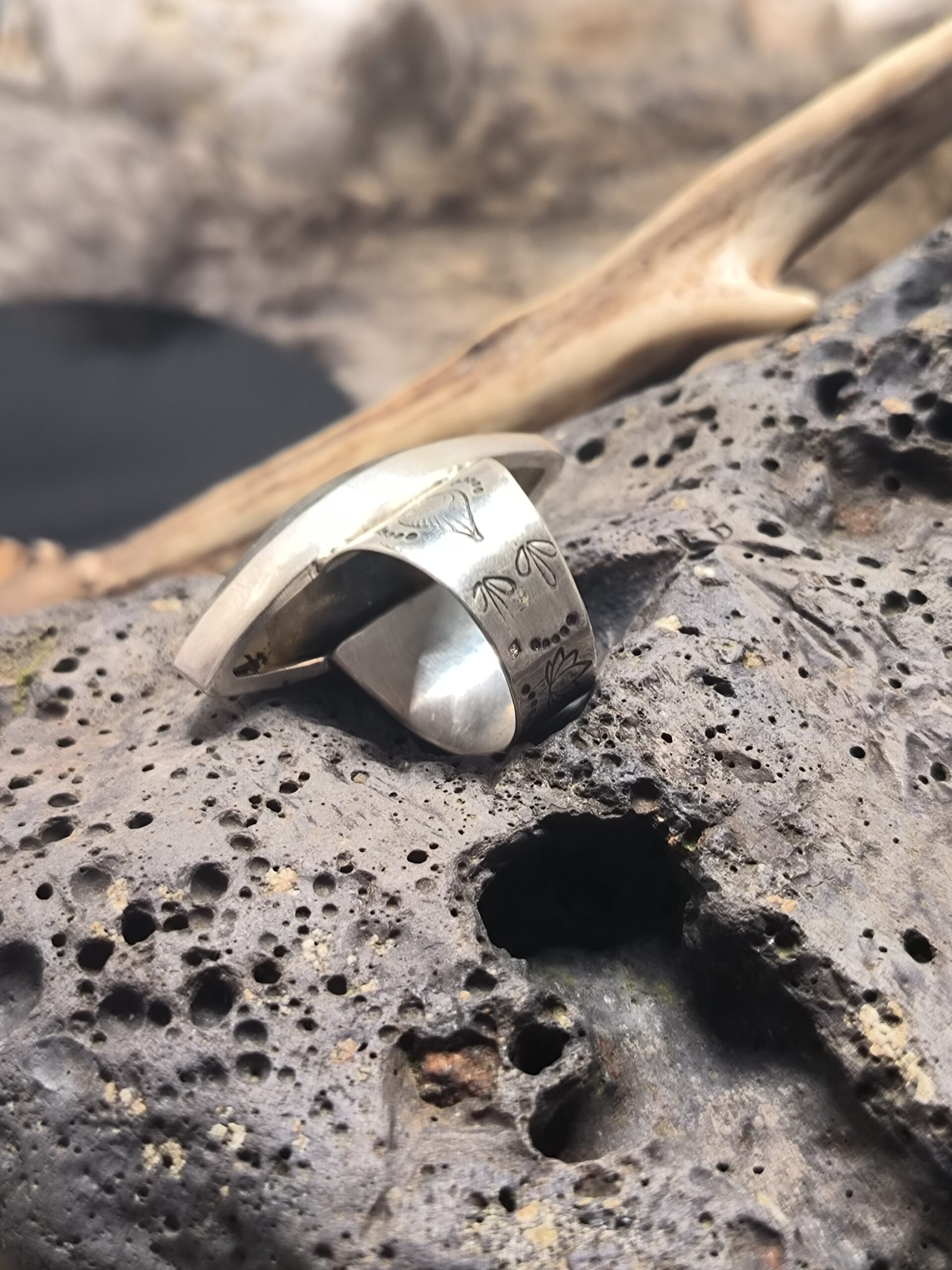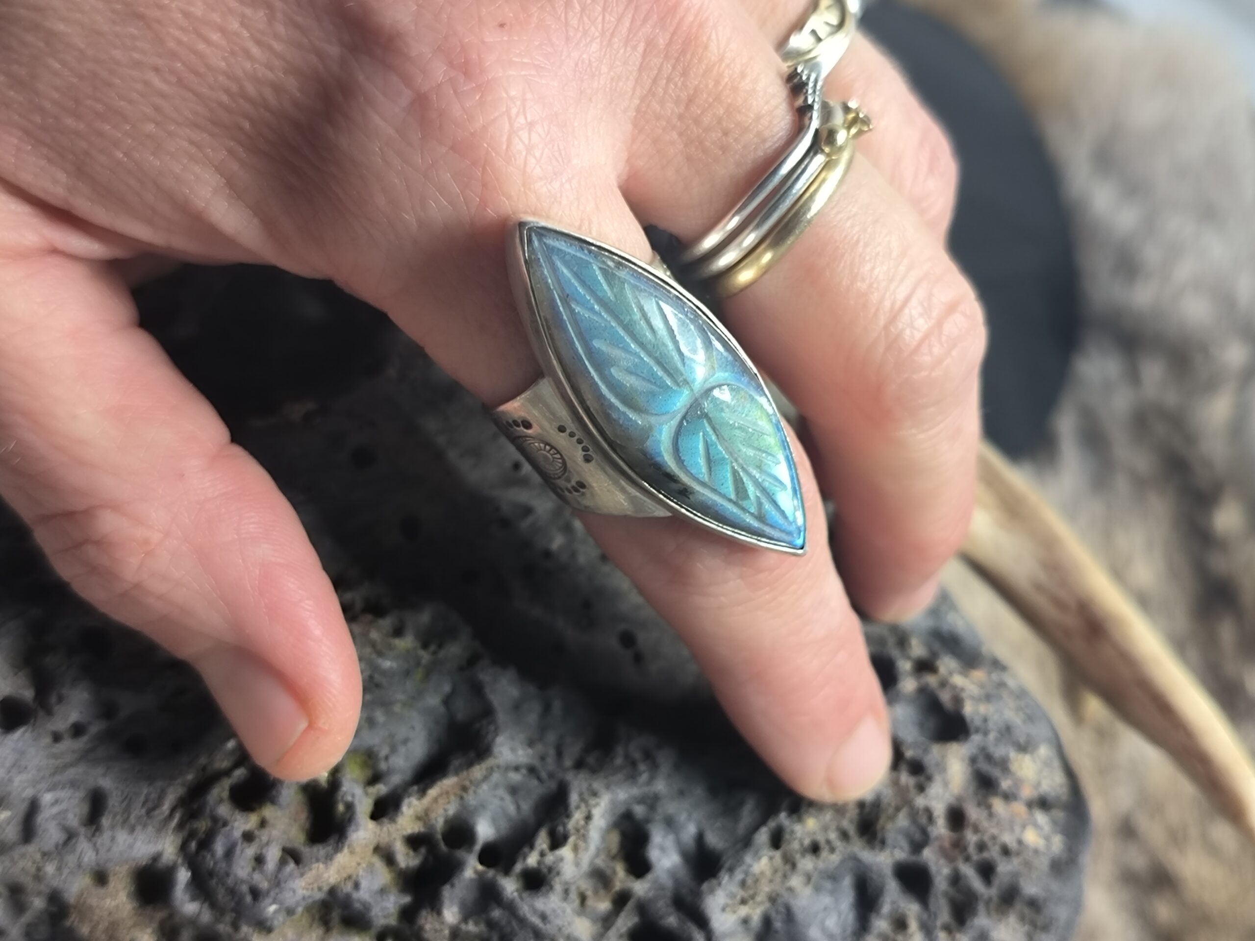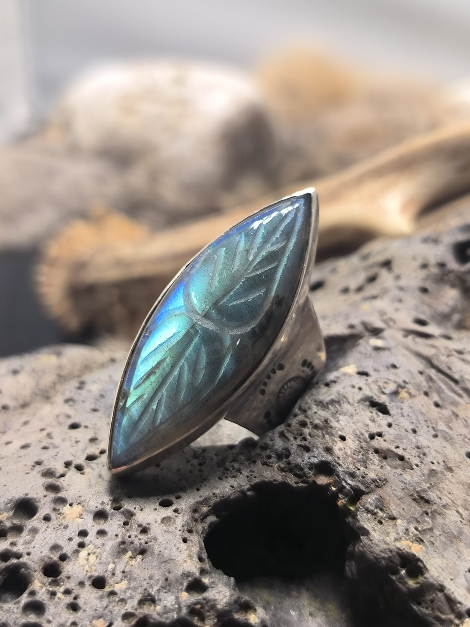 Ses reflets irisés bleu-vert évoquent les mondes subtils, l’intuition et la magie intérieure. La monture en argent 925, travaillée de manière organique, renforce son caractère chamanique et talismanique.
