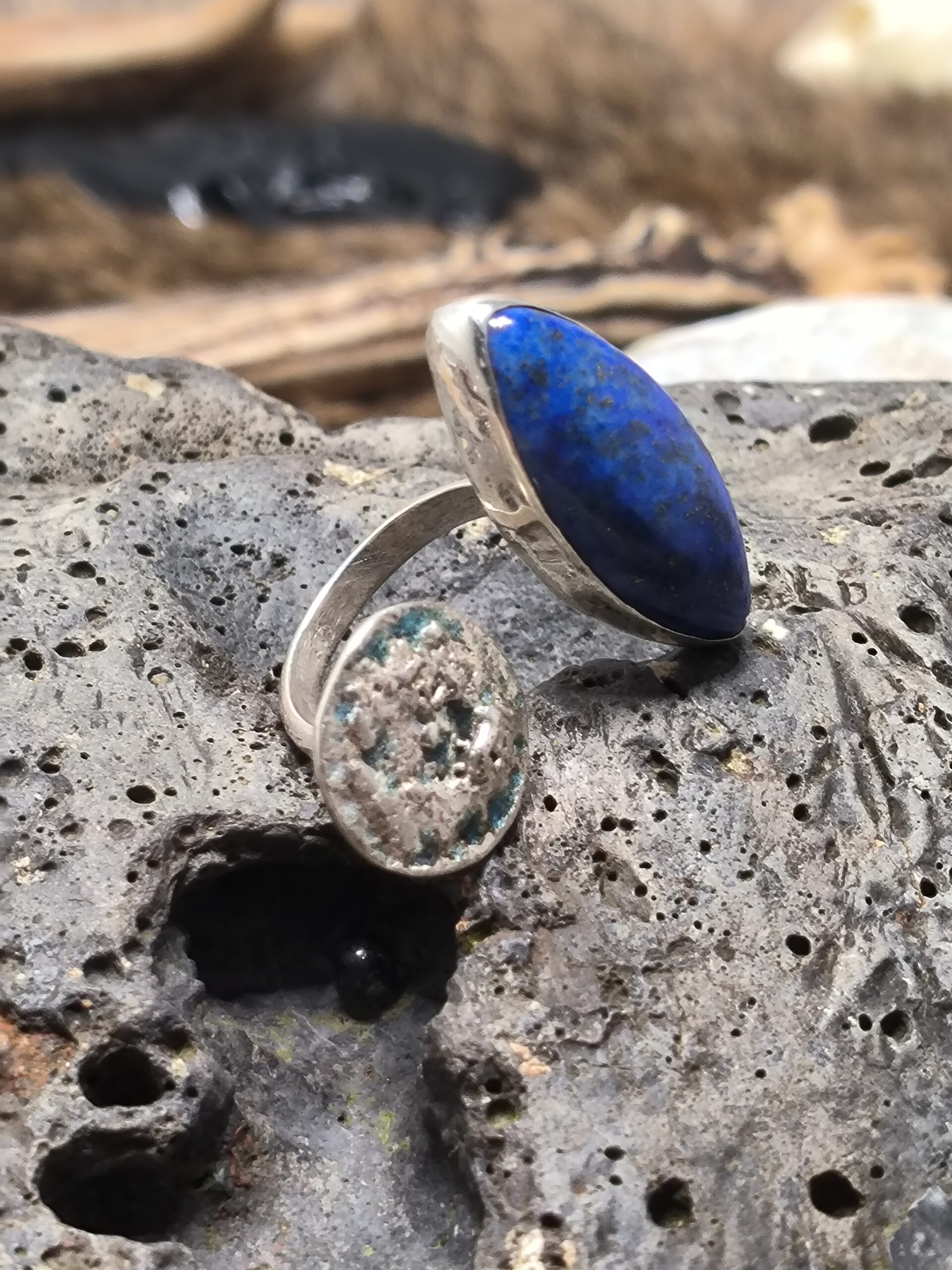 Cette bague ouverte en argent massif est sertie d’un magnifique lapis lazuli