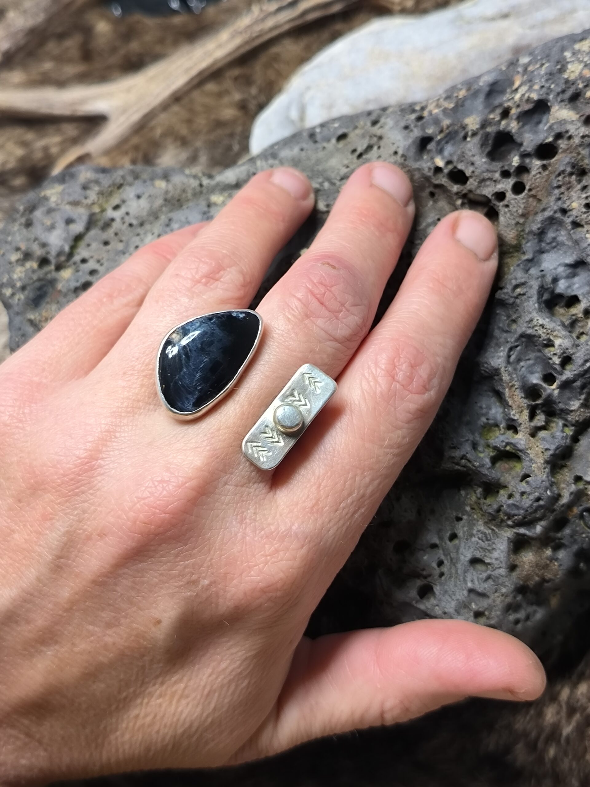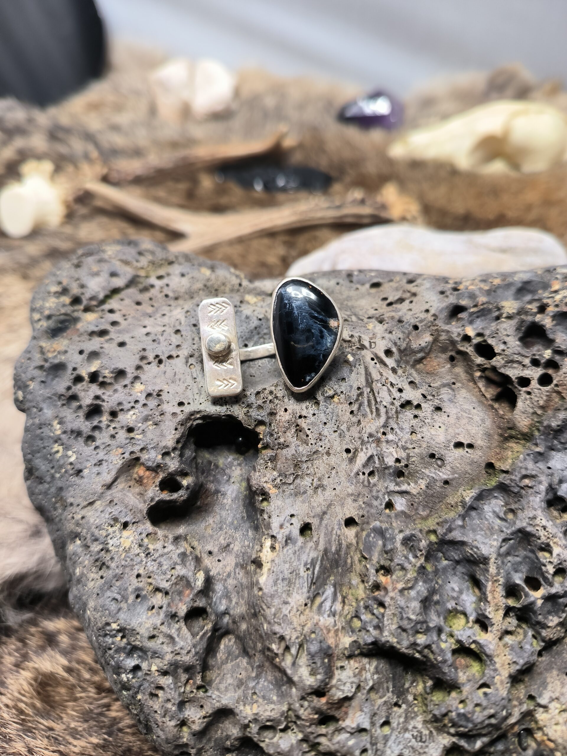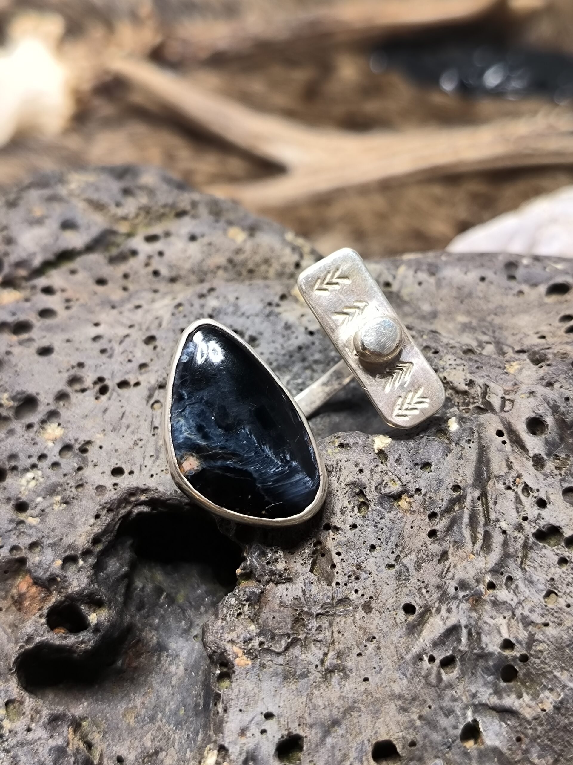 Bague ouverte en argent 925 sertie d’une superbe pierre naturelle de Pietersite, aux reflets profonds bleu nuit et nuances orageuses. Chaque pierre est unique, avec ses mouvements internes rappelant un ciel tempétueux.