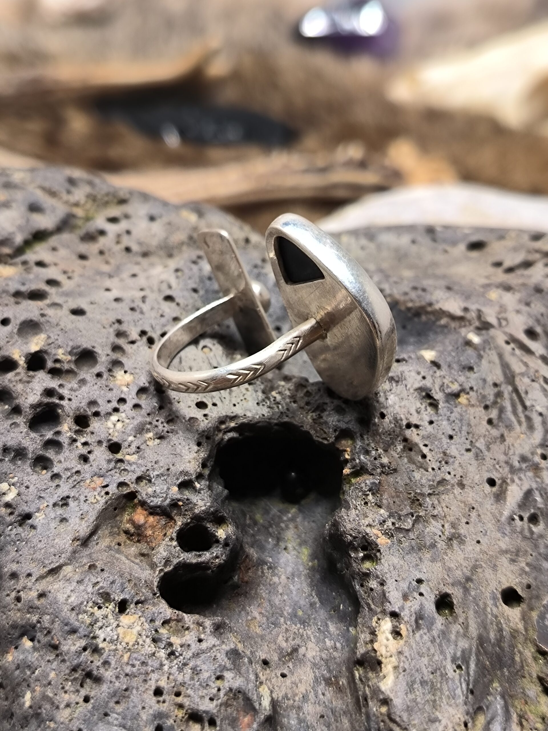 Son design ouvert et ajustable apporte une touche moderne et artisanale, tandis que la monture en argent massif met en valeur l’intensité naturelle de la pierre.