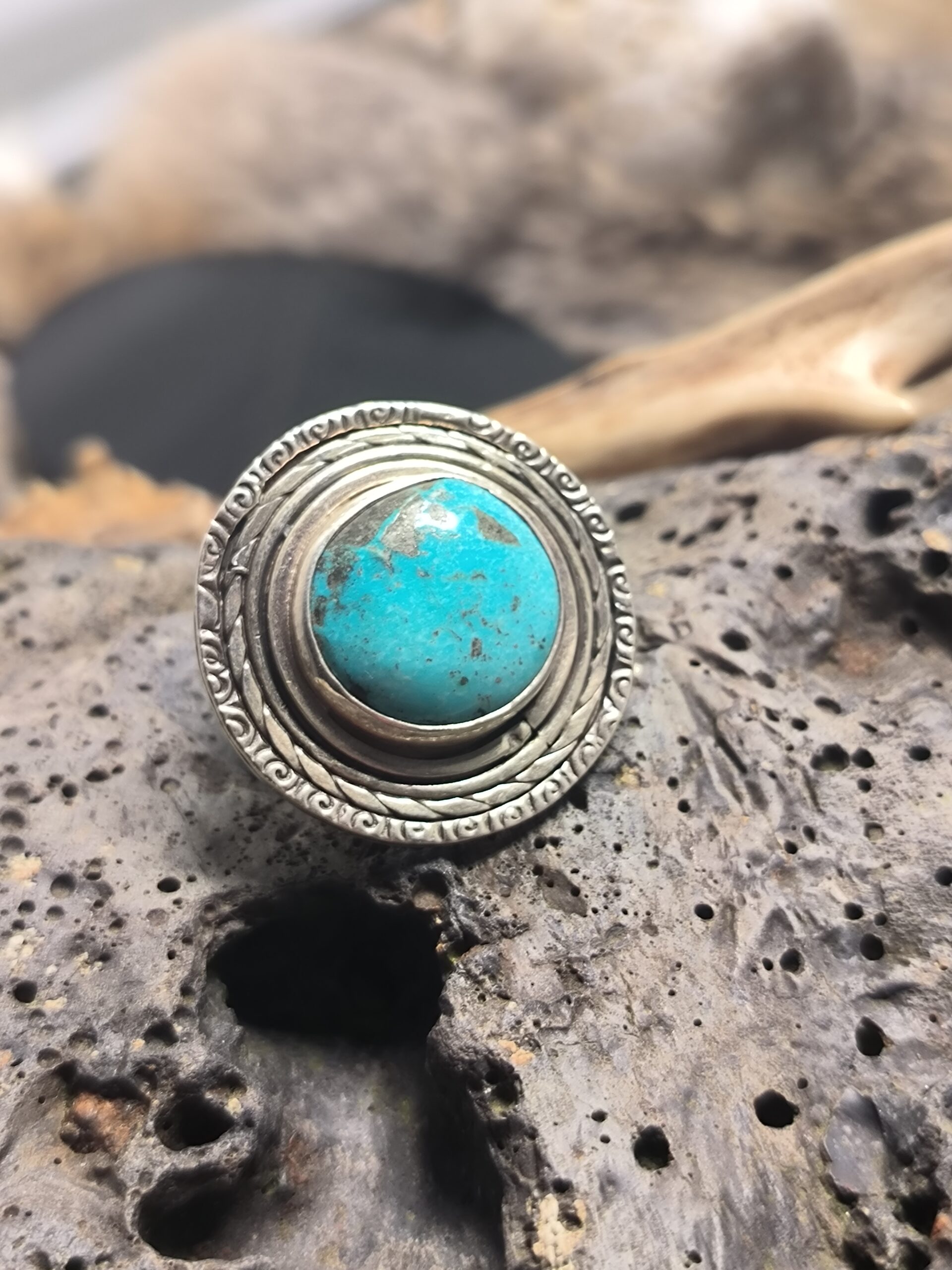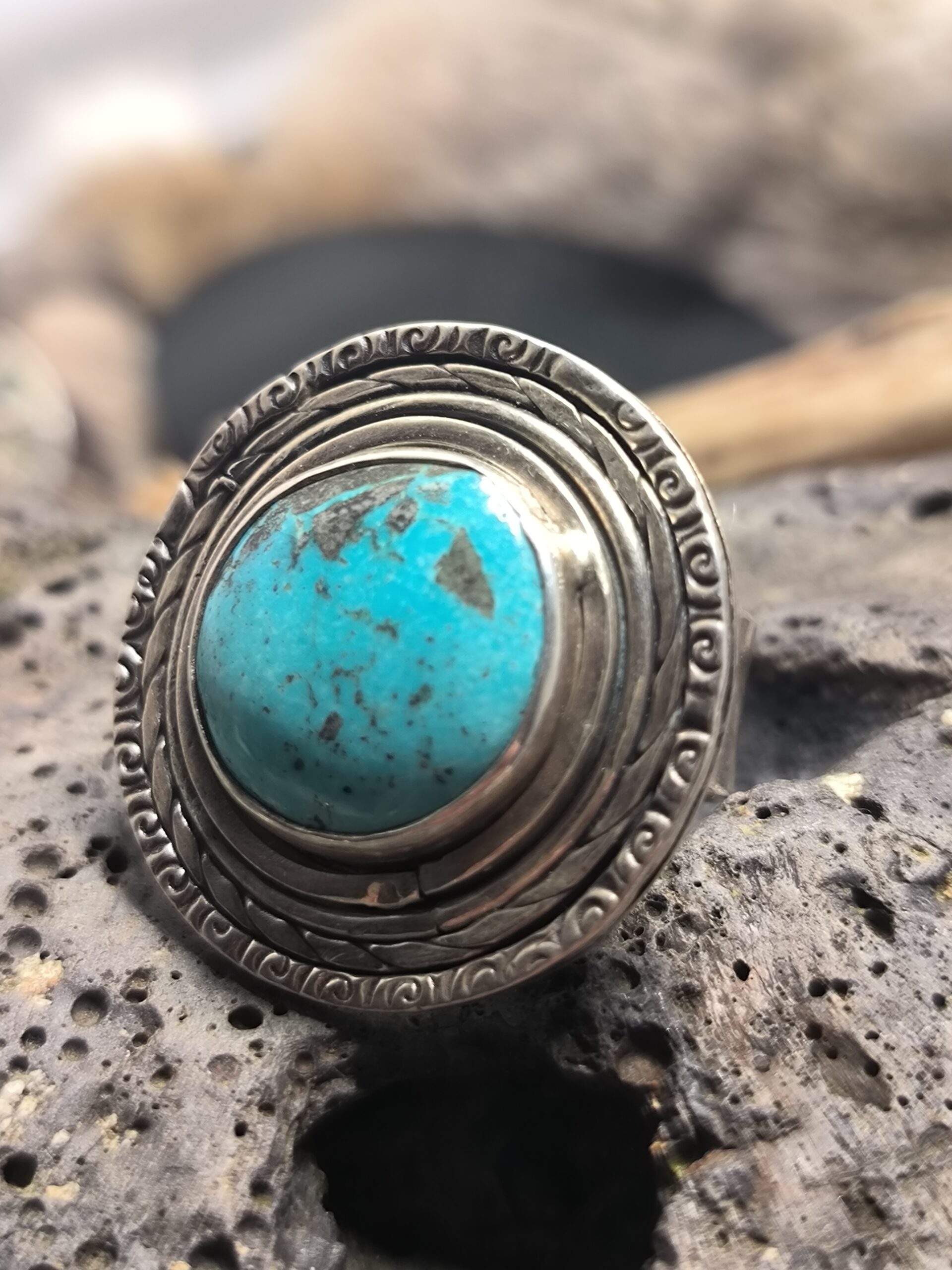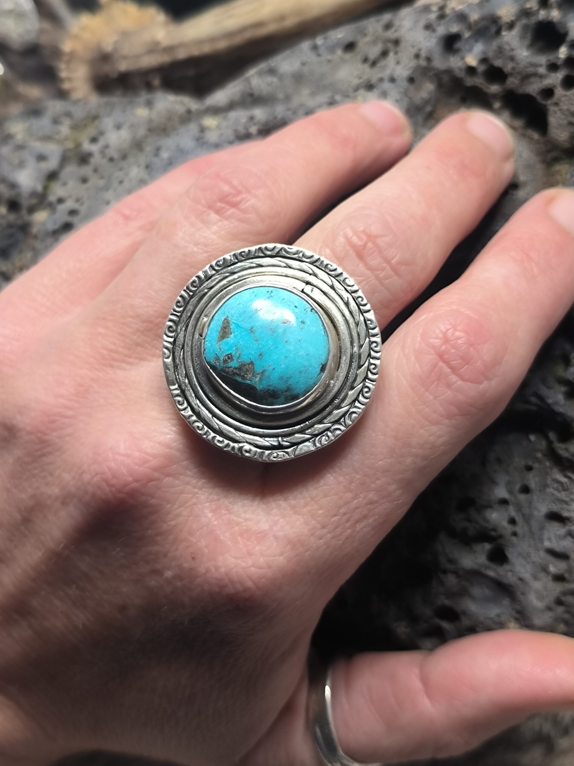 Bague artisanale en argent massif sertie d’une turquoise naturelle aux nuances bleu ciel profond. Son large sertissage circulaire et ses détails gravés lui donnent une allure ethnique et sacrée, faisant de cette pièce un véritable talisman à porter au quotidien.