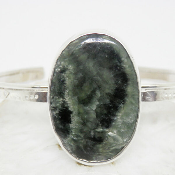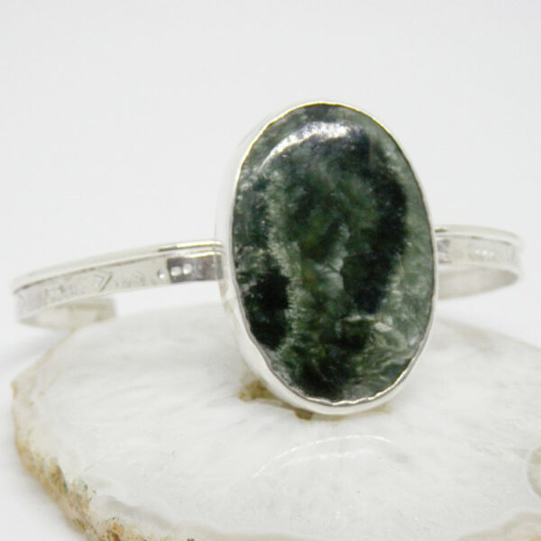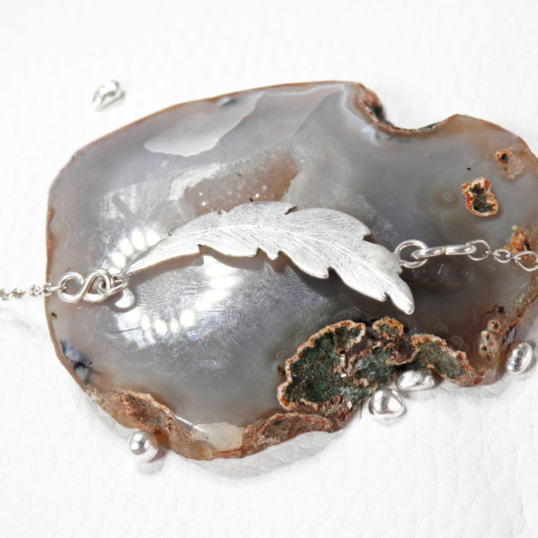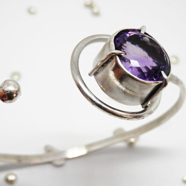 Imposant bracelet manchette orné d’une superbe agate druzy, naturelle, dont la géode donne un effet pailleté et scintillant sur le dessus de l’agate elle même dans les tons de gris. Cette pierre est posé sur le corps du bracelet composé d’un jonc épais qui forme une boucle laissant l’intérieur du bracelet ouvert.