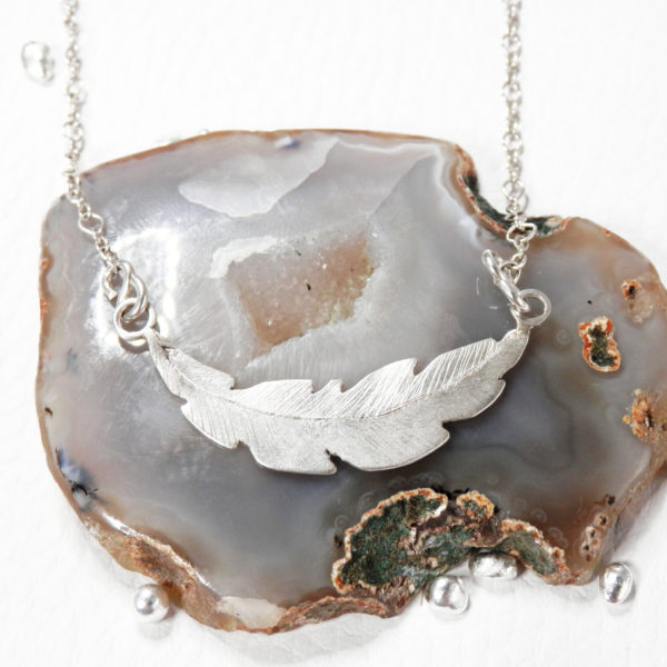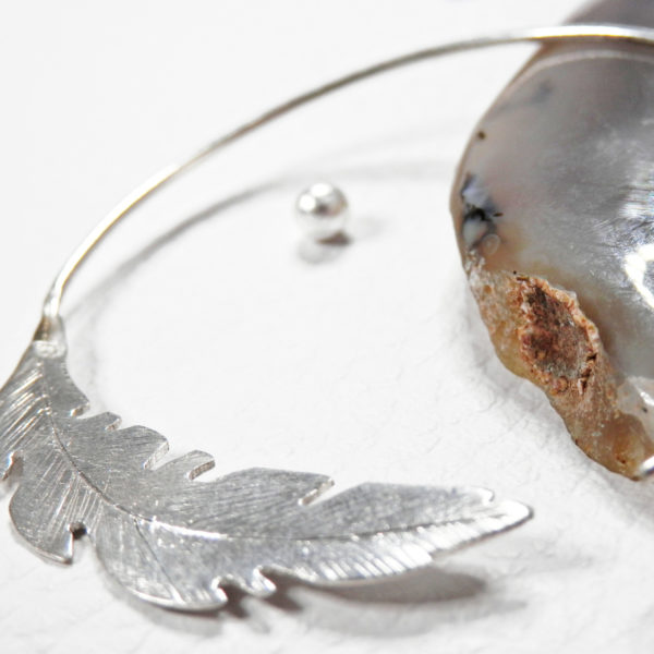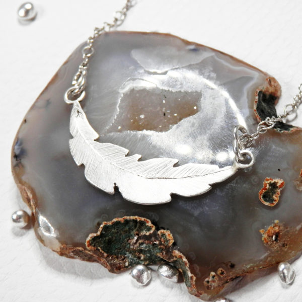 La plume et la chaîne sont en argent massif. Une chaînette est rajoutée en bout de chaîne pour permettre de le réglé à souhait.