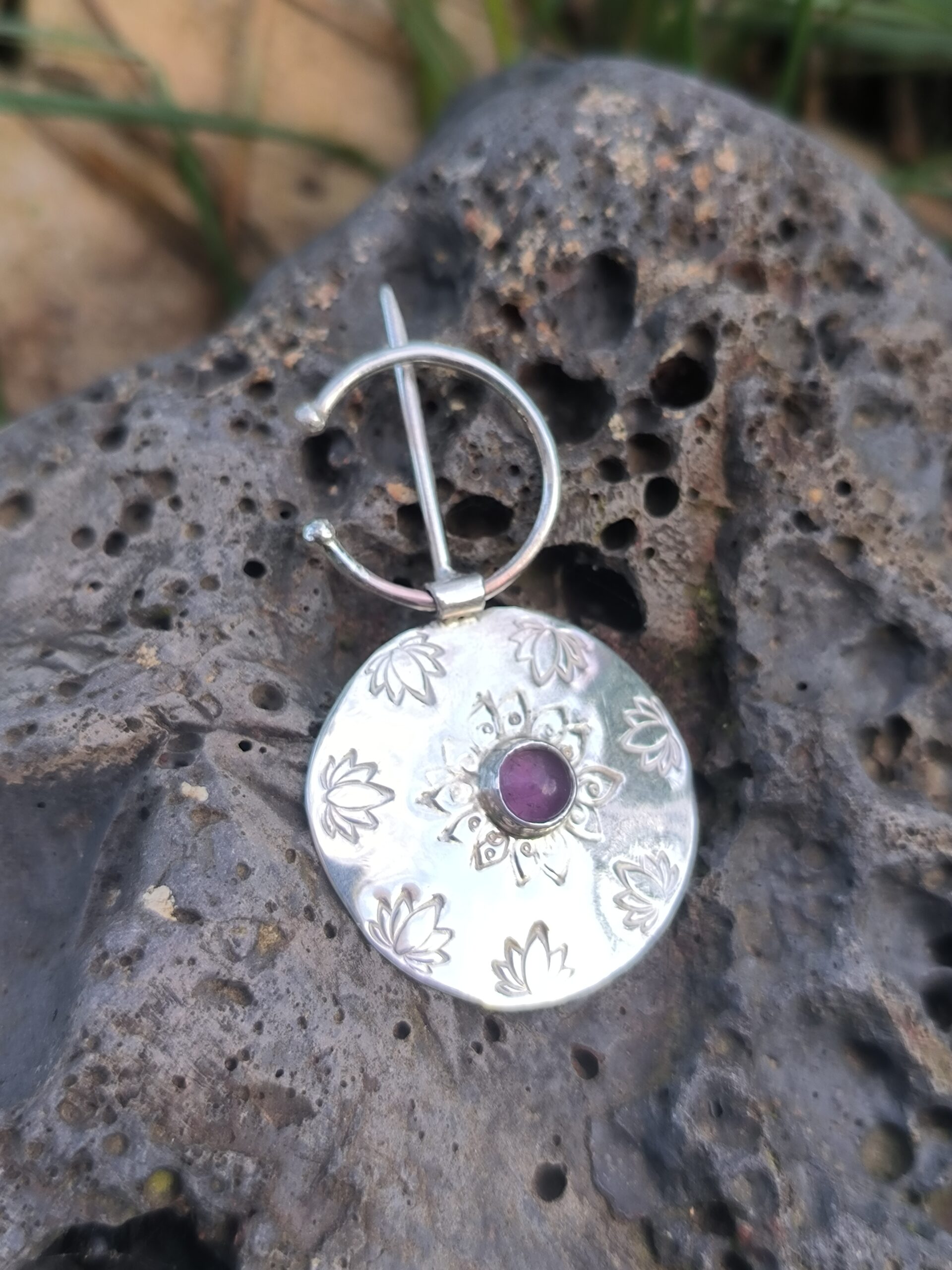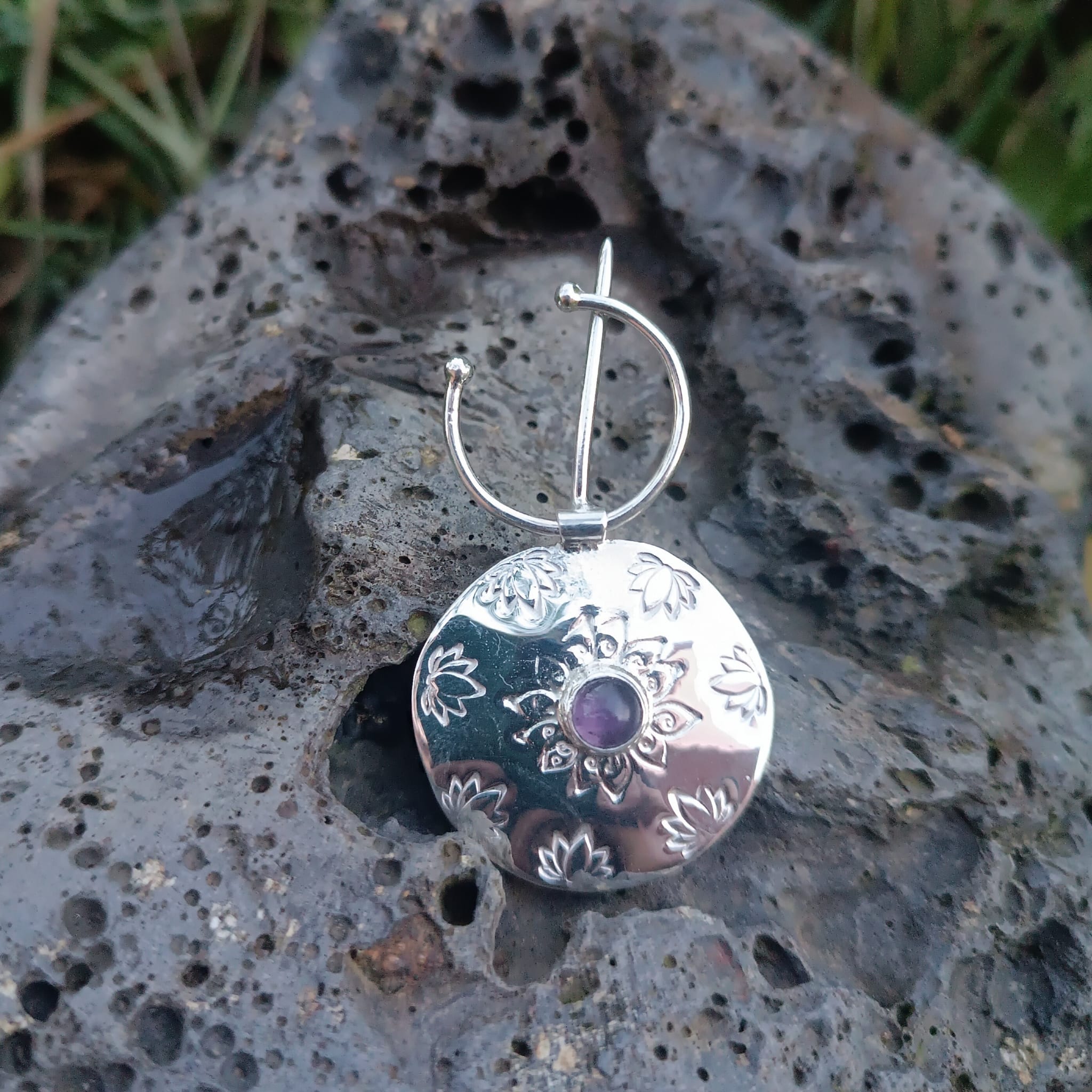 L’Améthyste régule tous les mécanismes de dépendance et d’addiction (alcool, drogues, alimentation, affectif, etc). Elle apporte la tempérance et équilibre les excès (trop ou pas assez). Elle régule et pacifie le rapport au père, à l’autorité et à la hiérarchie en général. Elle supprime la tendance à séparer les plans matériels et « spirituels ». Elle vous préserve de toutes formes de sectarisme. Portant l’énergie de transmutation, elle favorise les passages de vie et les passages de conscience. Elle porte l’énergie de transmission et de service aux autres. naturelle sertie au centre d’un motif solaire délicatement ciselé. Les gravures florales apportent une touche poétique et raffinée, faisant de cette pièce un bijou à la fois décoratif et fonctionnel. Inspirée des fibules traditionnelles, elle permet de maintenir un châle, une étole ou un vêtement avec grâce.