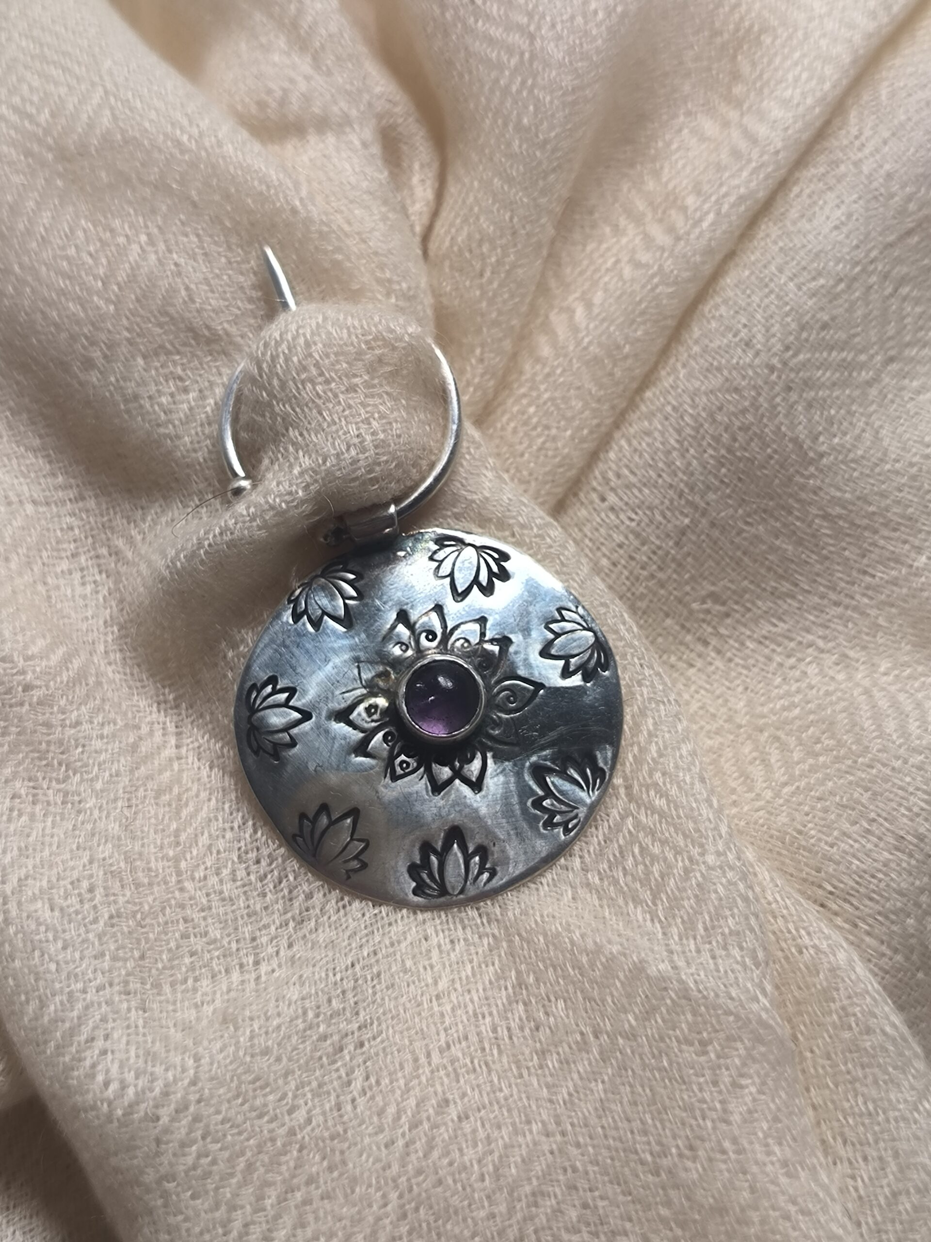 Élégante et intemporelle, cette fibule artisanale en argent massif est ornée d’une améthyste naturelle sertie au centre d’un motif solaire délicatement ciselé. Les gravures florales apportent une touche poétique et raffinée, faisant de cette pièce un bijou à la fois décoratif et fonctionnel. Inspirée des fibules traditionnelles, elle permet de maintenir un châle, une étole ou un vêtement avec grâce.