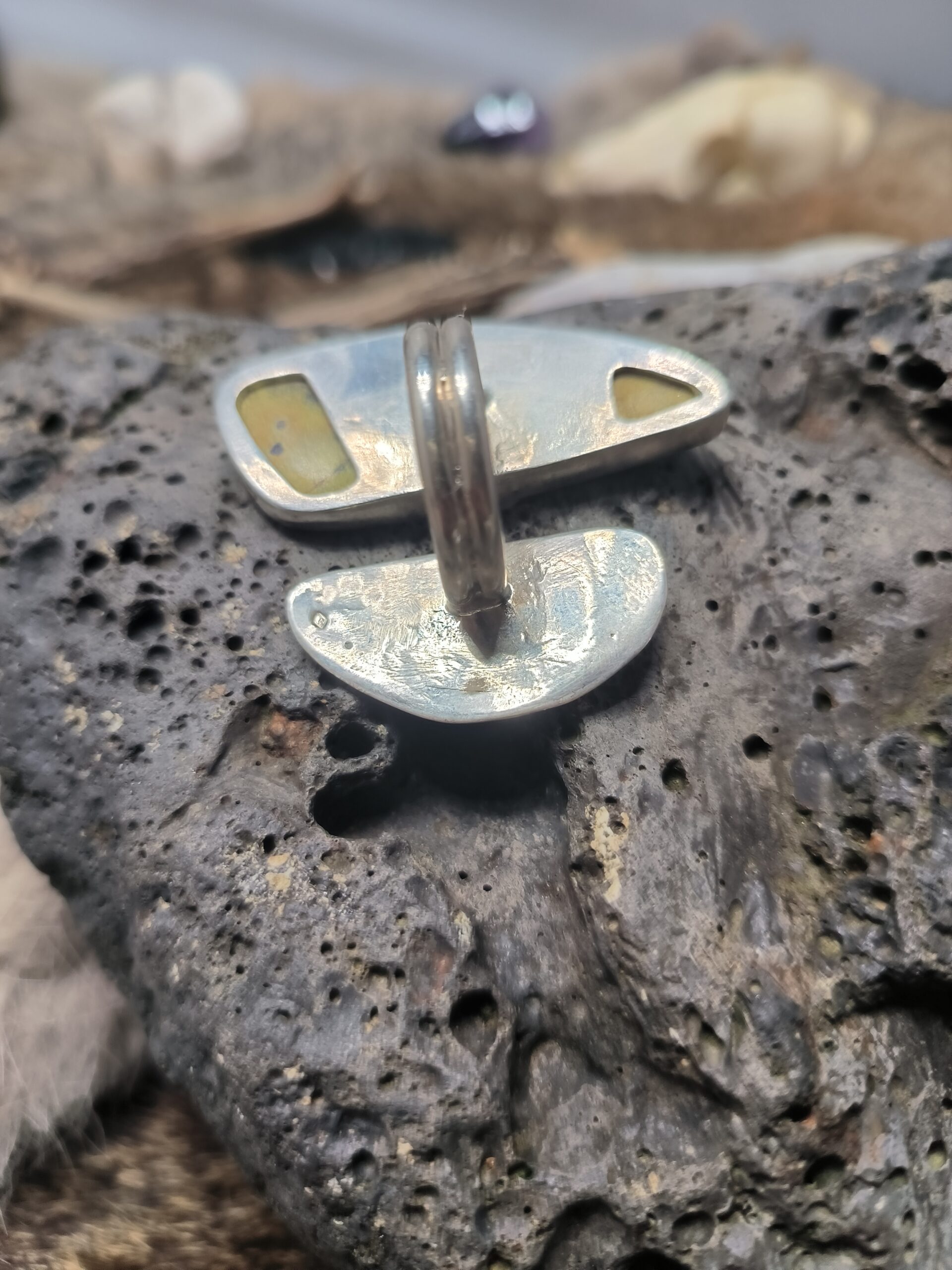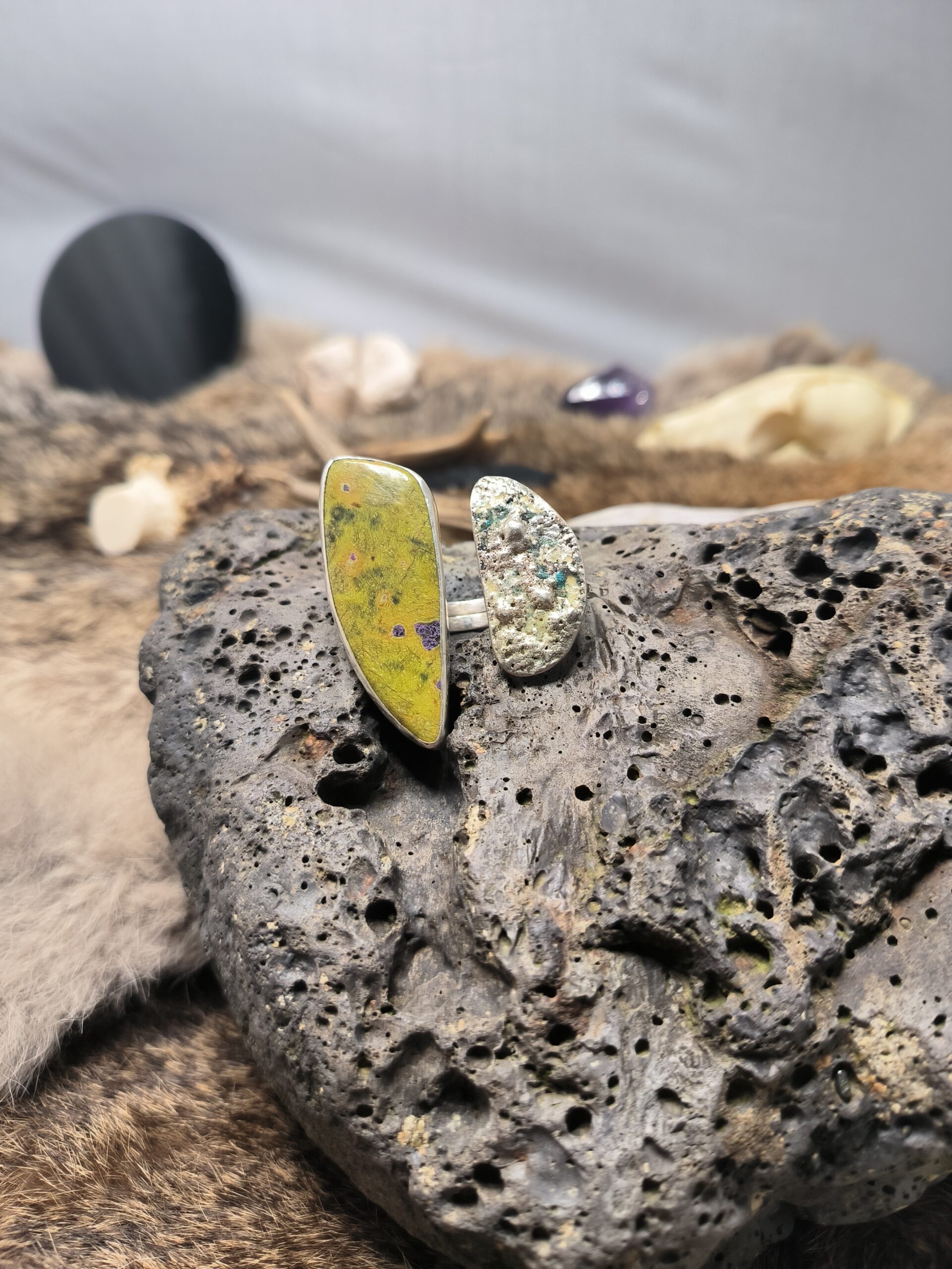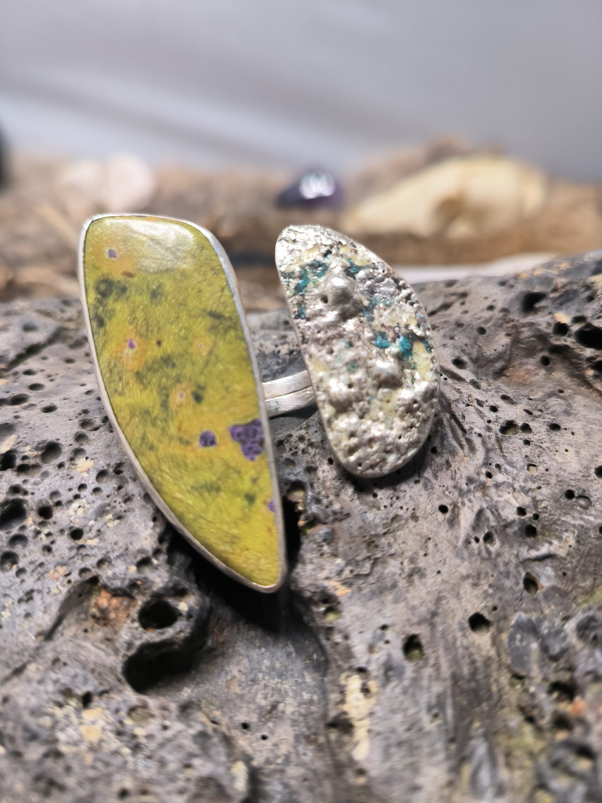 Cette bague artisanale en argent massif met en valeur une superbe Atlantisite, pierre rare aux nuances vert olive ponctuées d’inclusions pourpres de stichtite. Sa forme allongée et organique souligne l’élégance de la main, tandis que la monture originale apporte une touche contemporaine et brute.