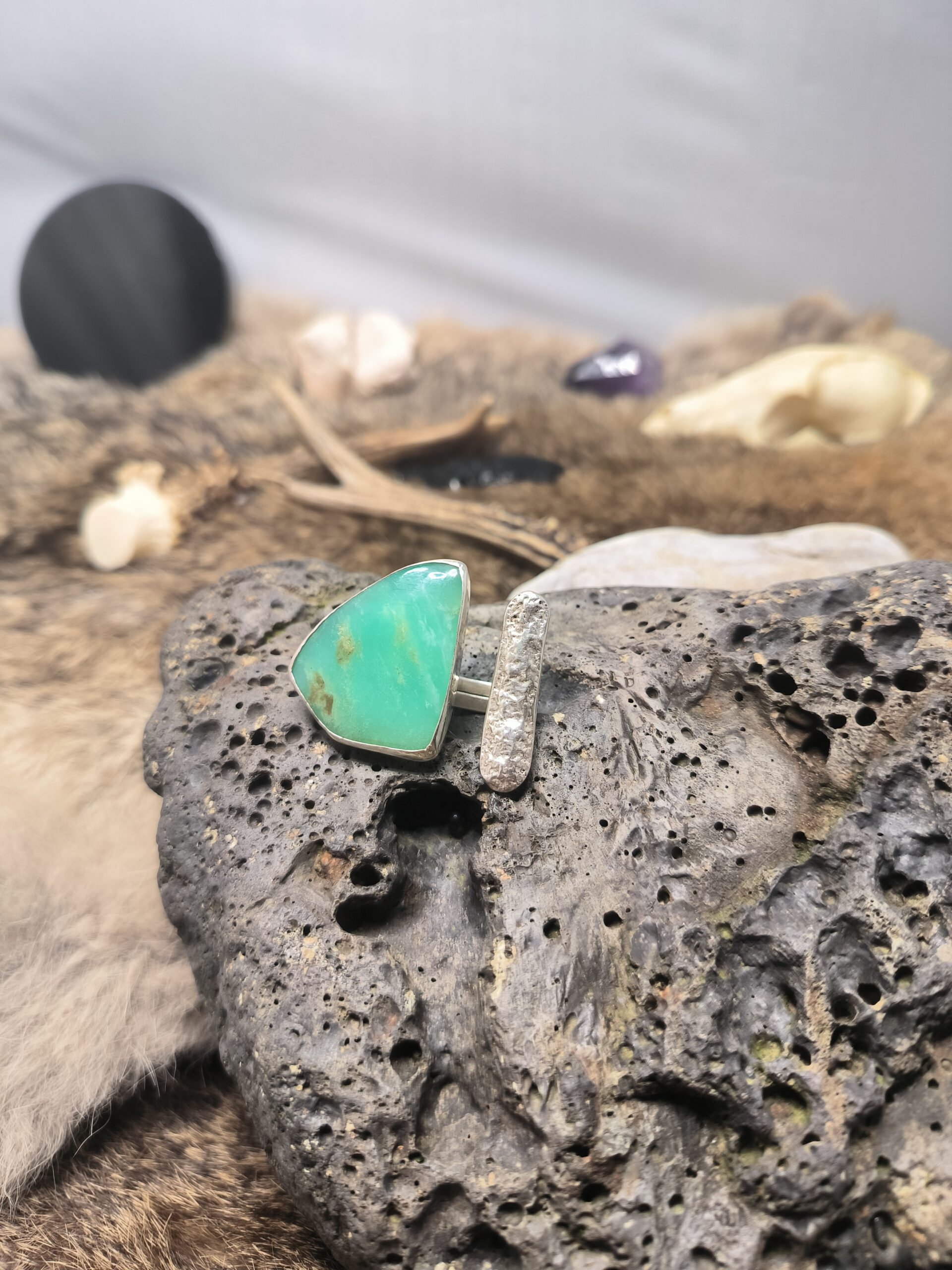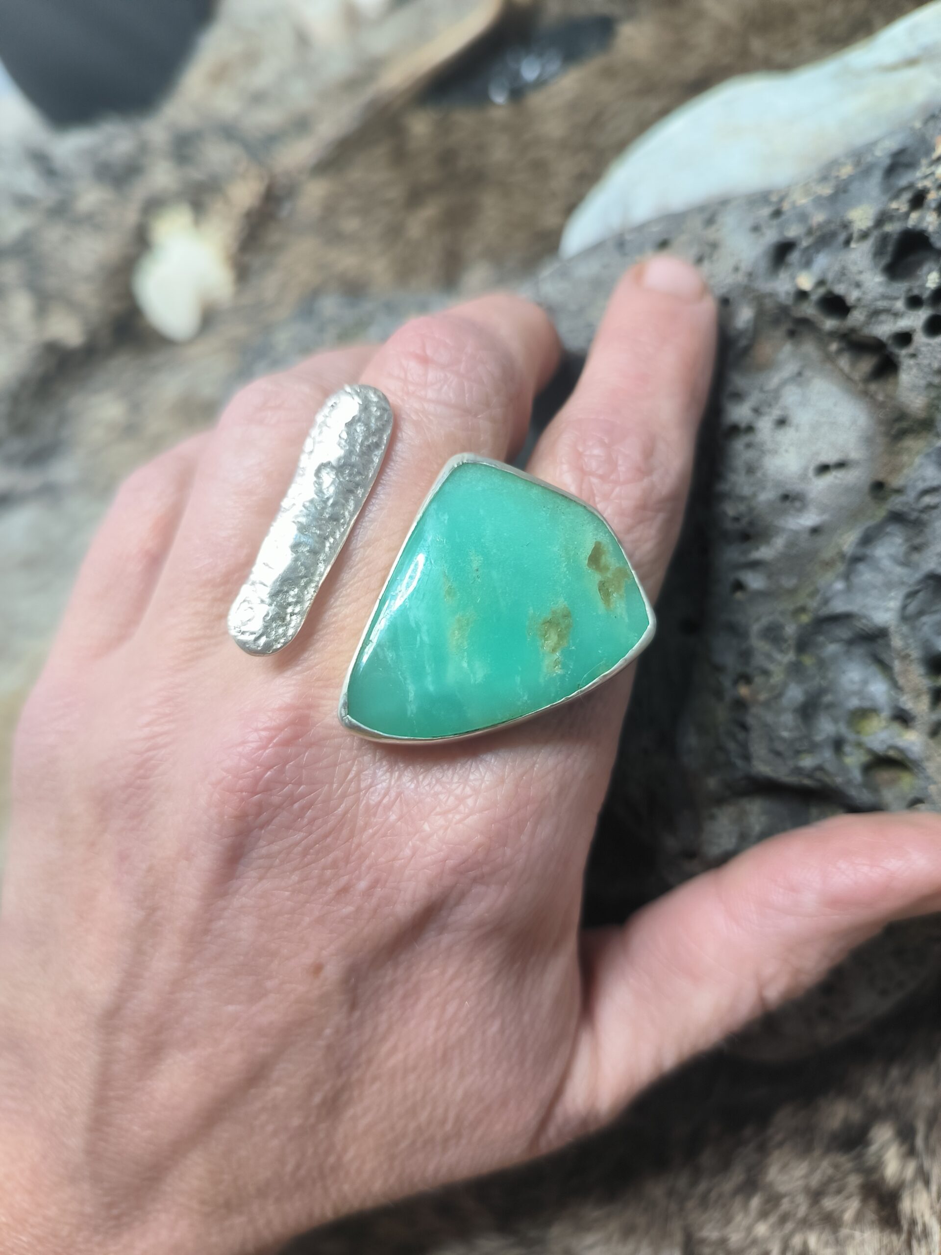 Cette bague artisanale en argent 925 met en valeur une magnifique chrysoprase naturelle, pierre fine réputée pour sa couleur vert menthe intense et ses inclusions uniques. Sa monture, originale, avec une bande en argent travaillé qui fait face à la pierre, lui confère un style contemporain et élégant, idéal pour un look bohème ou moderne.