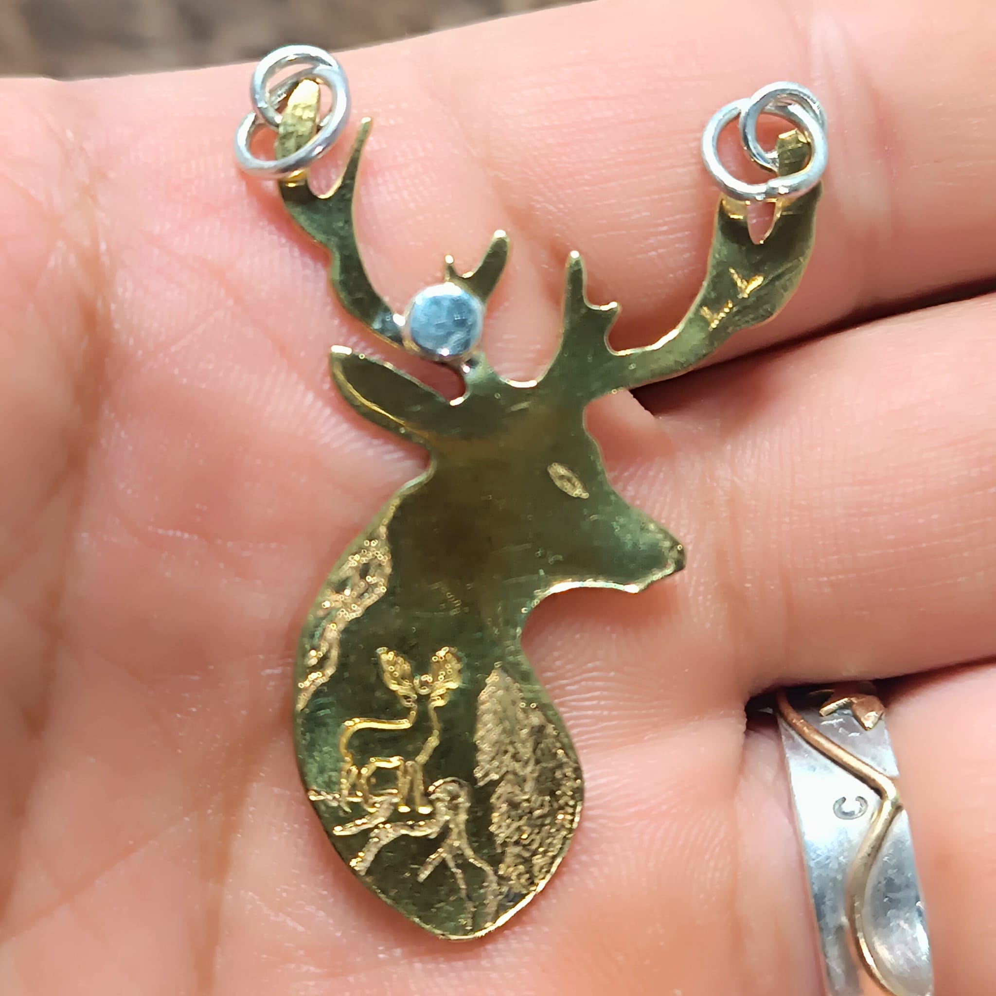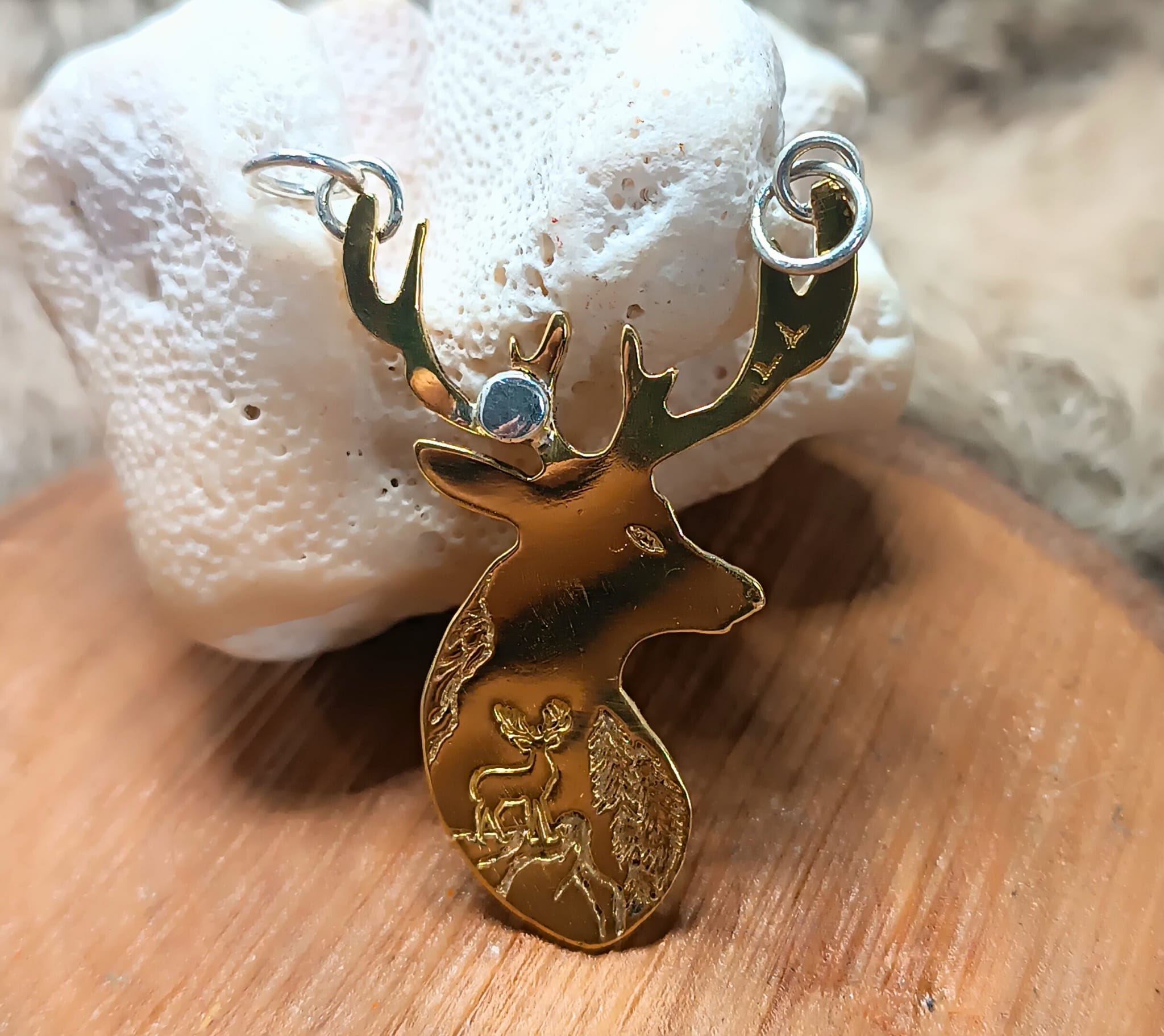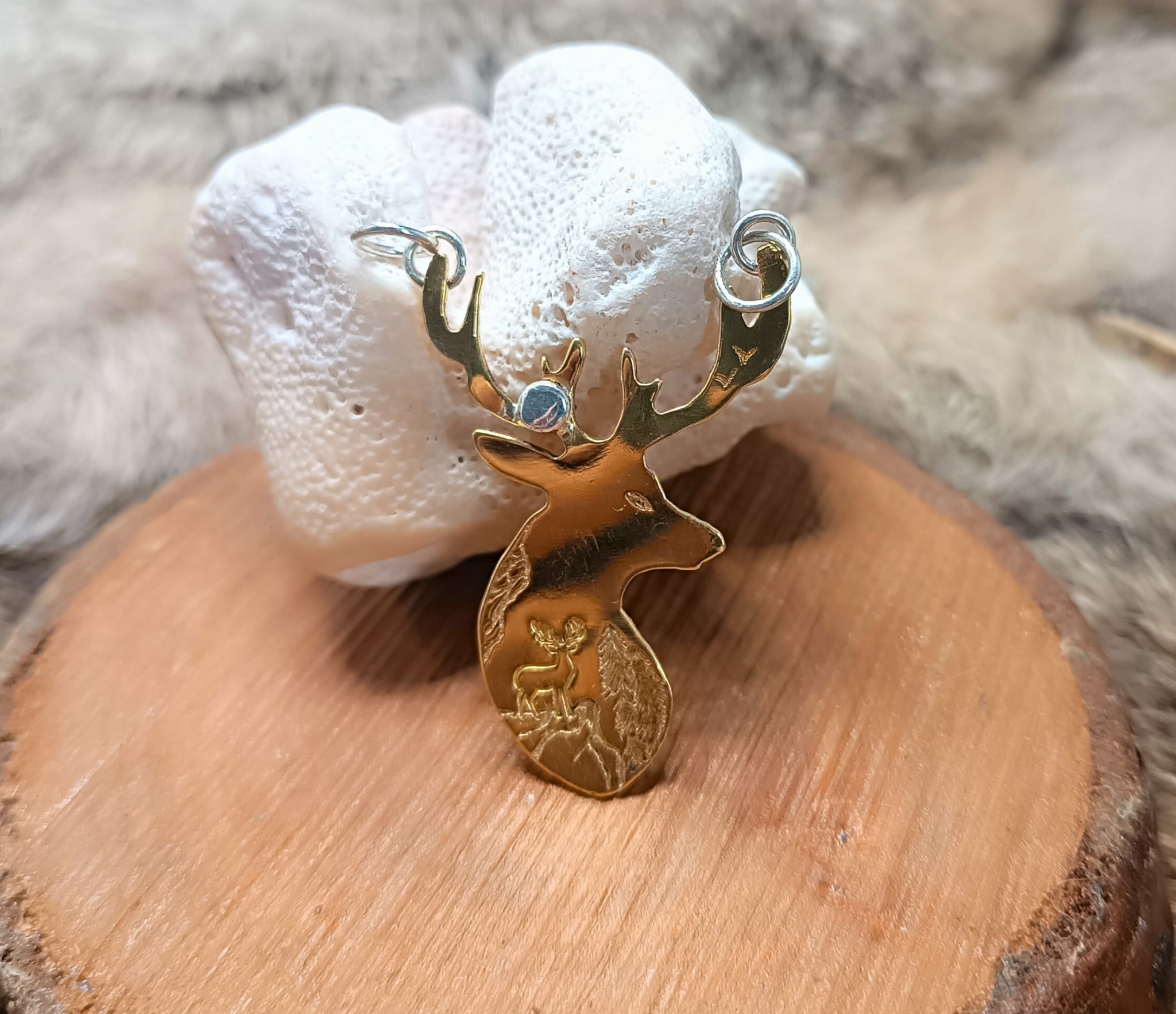 Finement travaillé, ce bijou représente la silhouette majestueuse du cerf, animal sacré associé à la noblesse de l’âme, à l’intuition et à la renaissance spirituelle. Ses bois élancés évoquent l’élévation, la croissance personnelle et le lien profond entre la terre et le monde subtil.