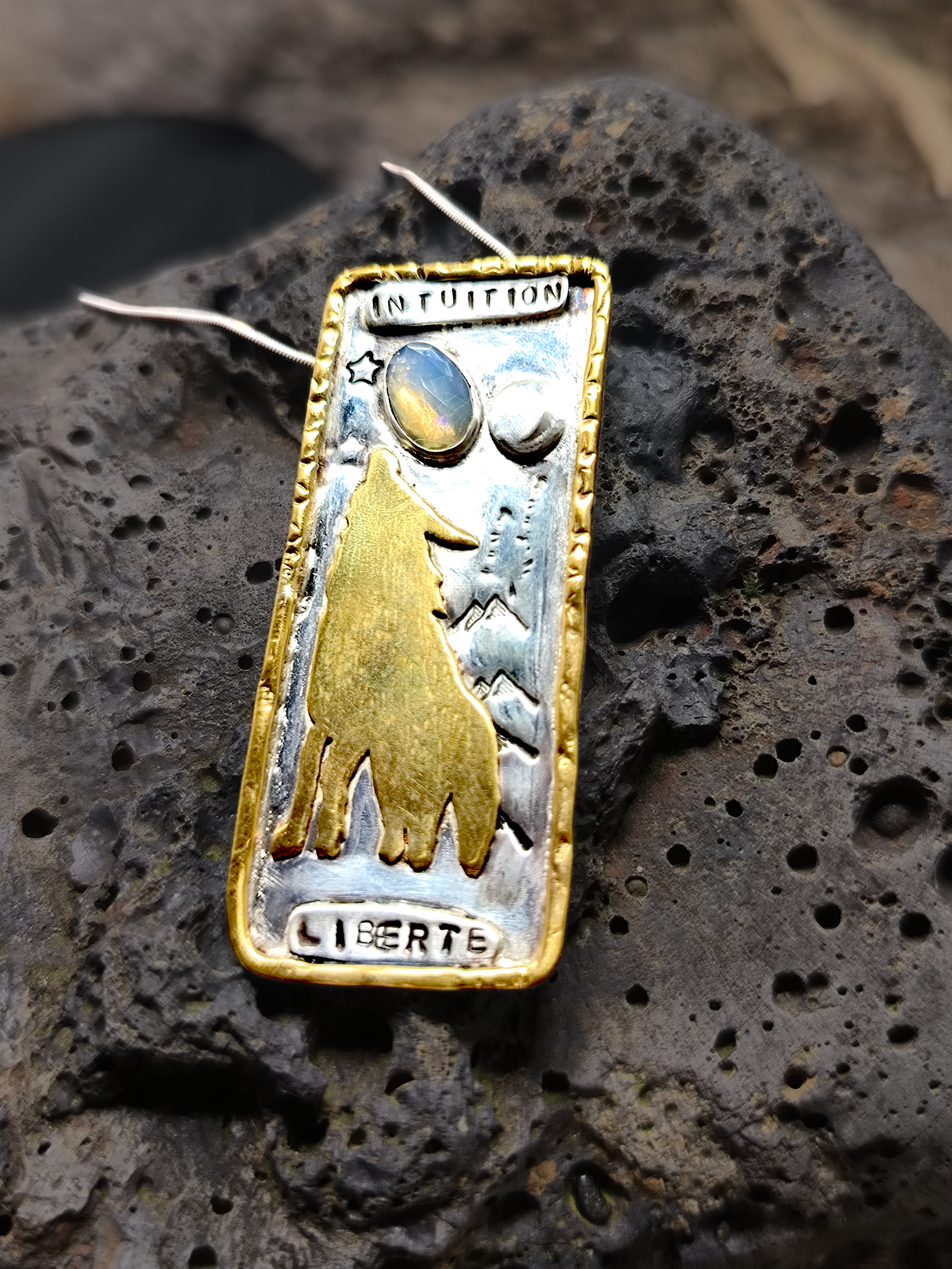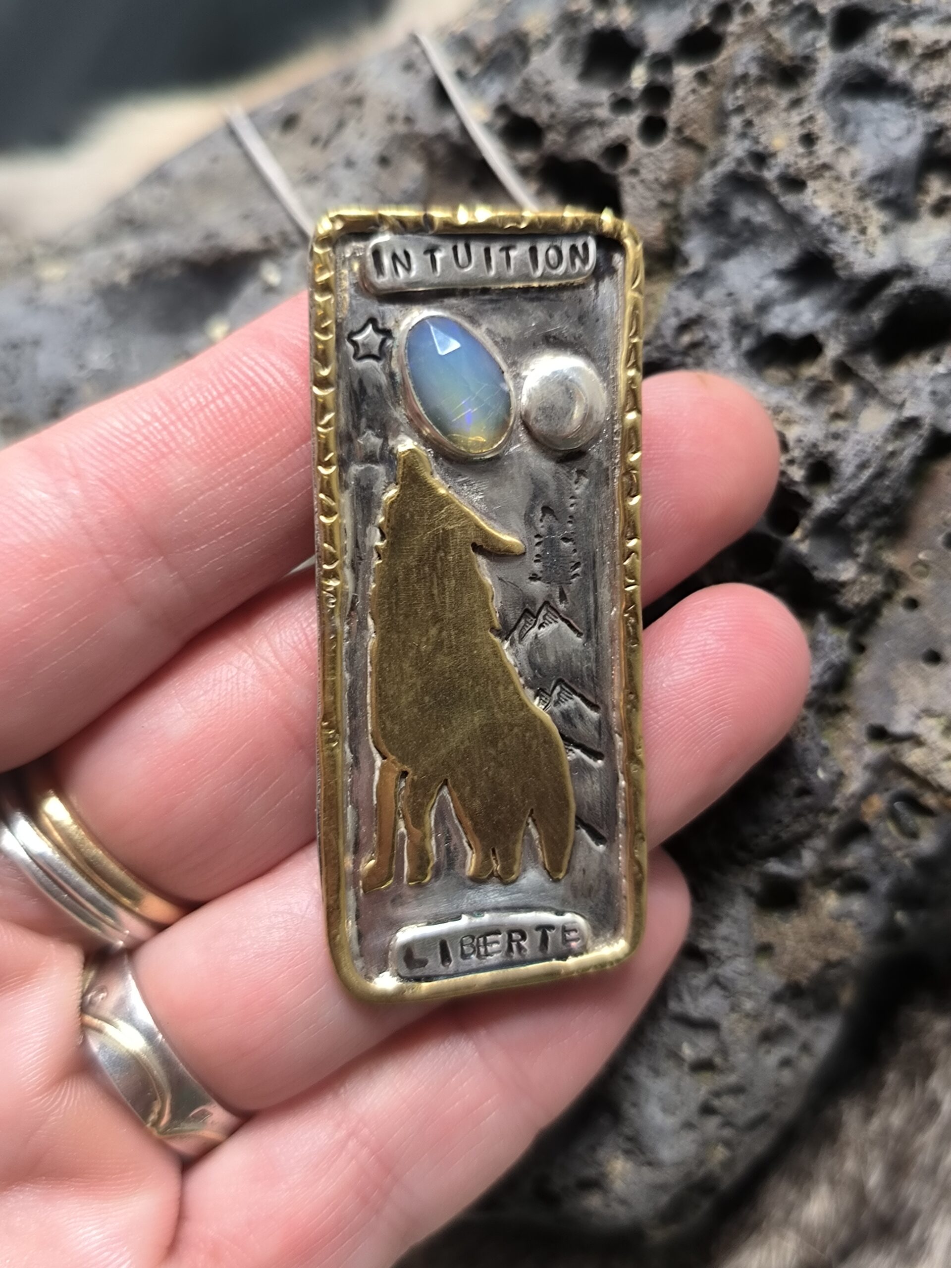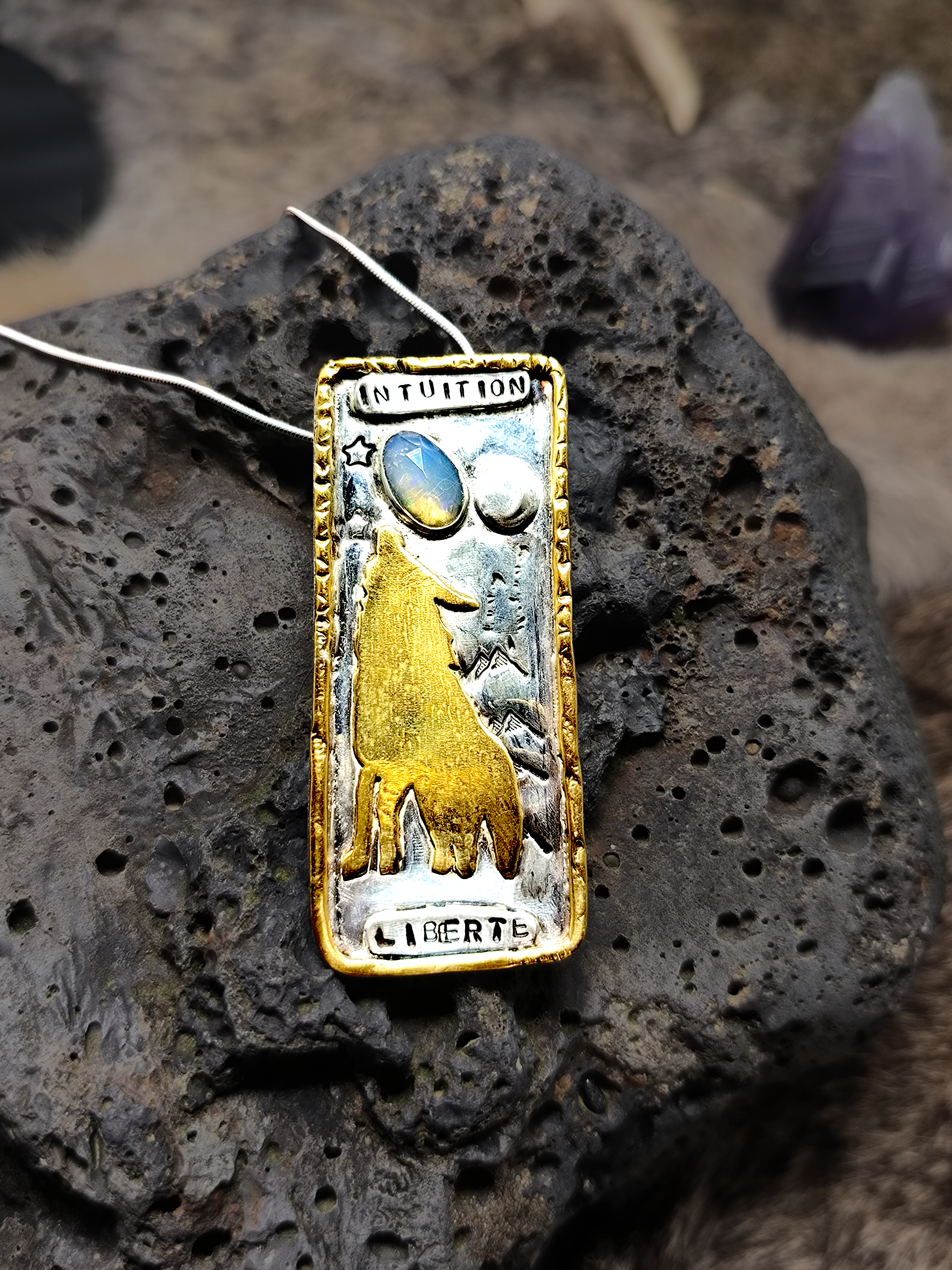 Ce pendentif artisanal en argent massif et laiton représente le loup, animal totem de l’intuition et de la liberté. Il est orné d’une opale naturelle aux reflets changeants, évoquant la lumière intérieure et la guidance instinctive. Les inscriptions « INTUITION » et « LIBERTÉ » renforcent la symbolique de ce bijou talisman, conçu pour accompagner celles et ceux qui suivent leur voie avec confiance.