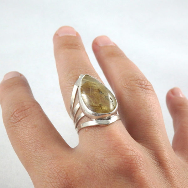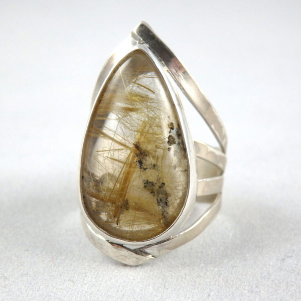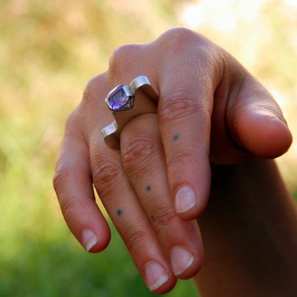 L’anneau de la bague texturée pour un effet brut qui contraste avec la pierre