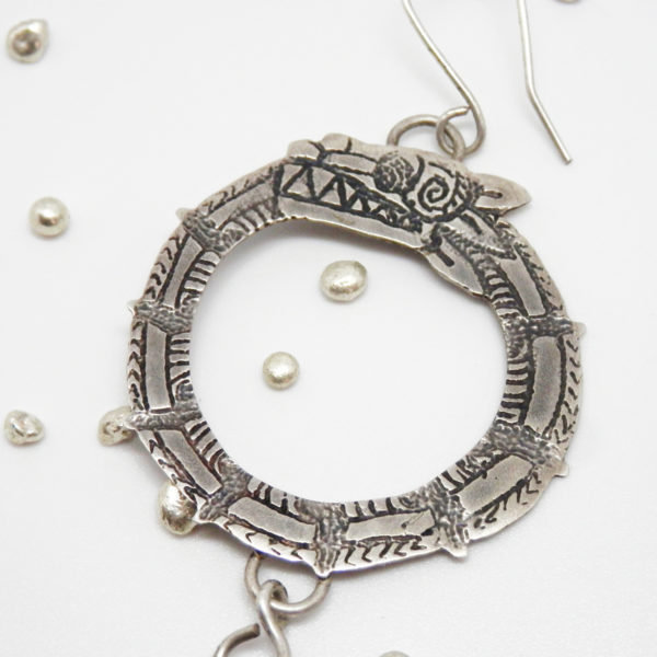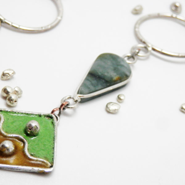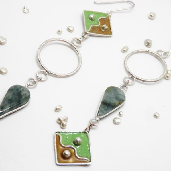 Boucles d’oreilles en argent massif, jade maya et émail.