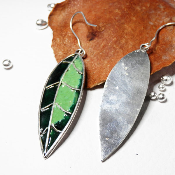 De superbes boucles d’oreilles feuilles en argent massif, colorées avec la technique de l’émail en verre