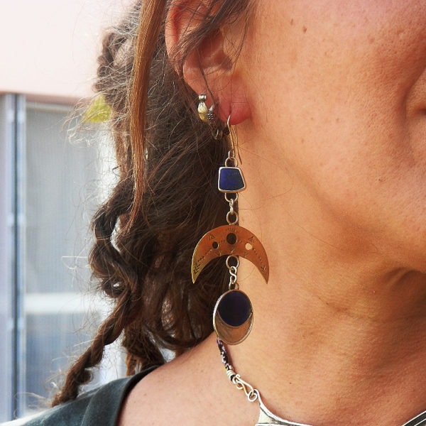 Longues boucles d’oreilles lunes et lapis lazuli, argent