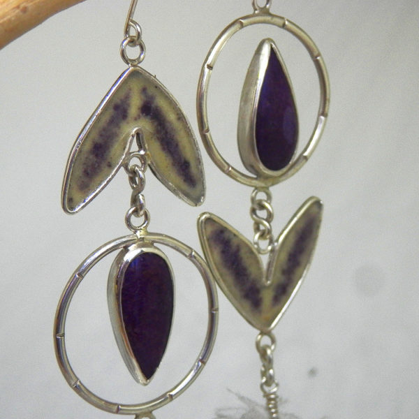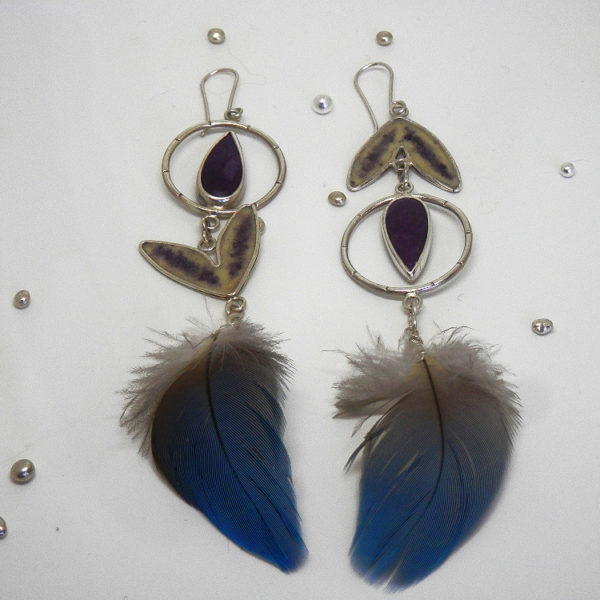 Longues boucles d’oreilles argent, sugilites, émaux et plumes