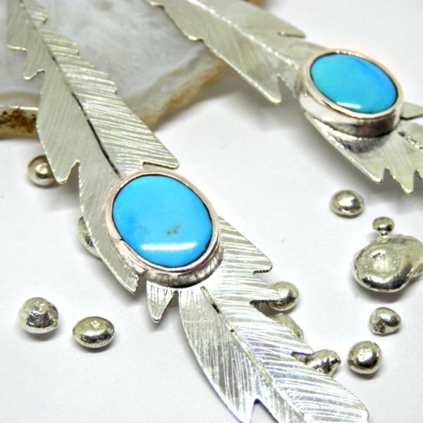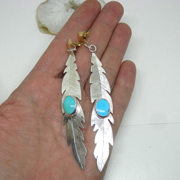 Longues Boucles d’oreilles plumes Argent massif et turquoises naturelles