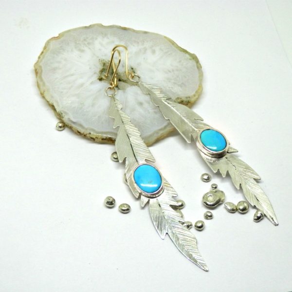 Longues Boucles d’oreilles plumes Argent massif, Or 18k et turquoises naturelles