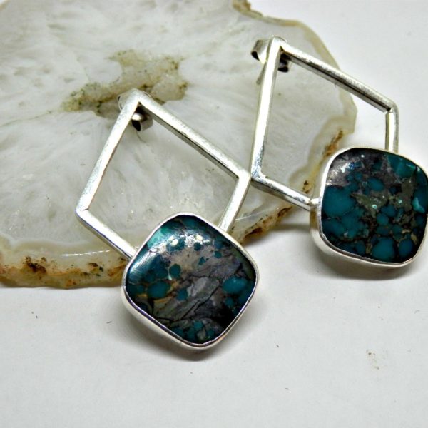 Turquoises mouchetées montées sur des créoles en argent massif. Pièce unique.