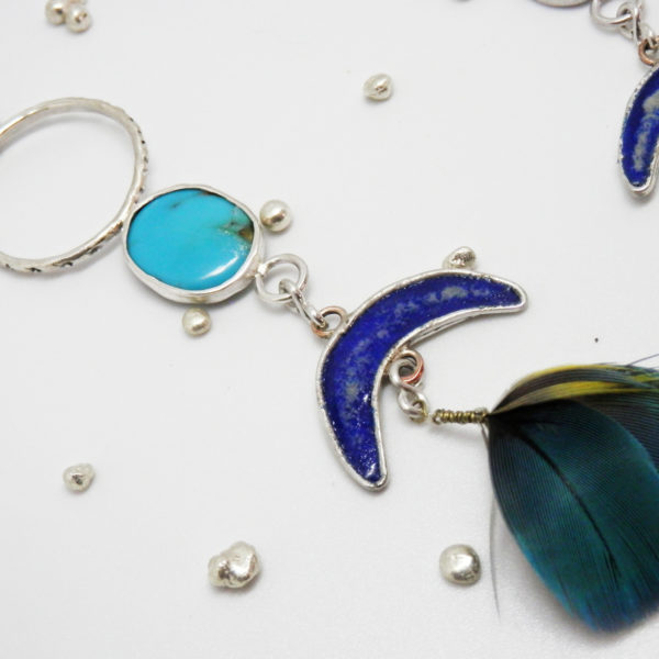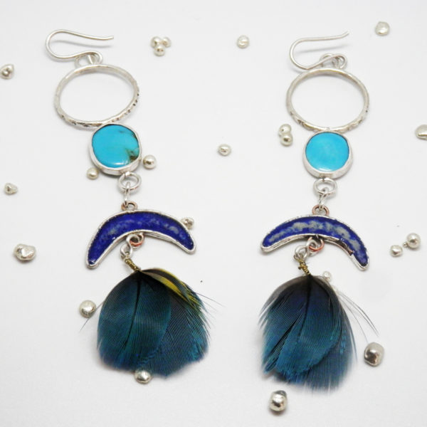 Longues boucles d’oreilles en Argent massif, Turquoise, émail et plumes.