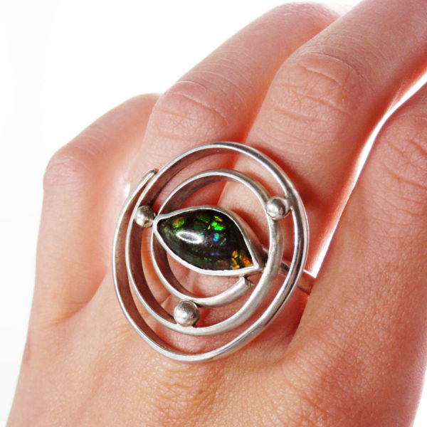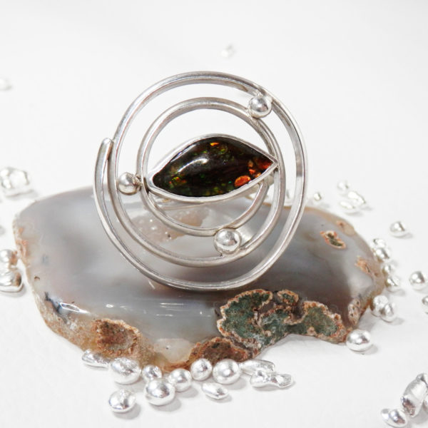 Bague planète en argent massif avec au centre un superbe fossil amolite opalisé.