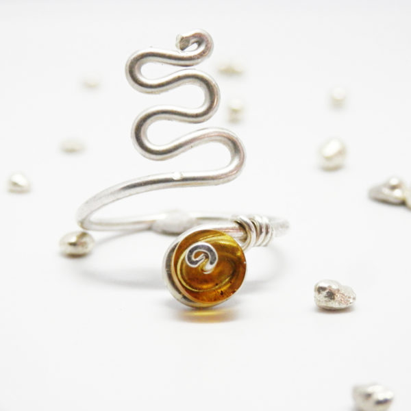 Bague planète en argent massif avec au centre un superbe fossil amolite opalisé.