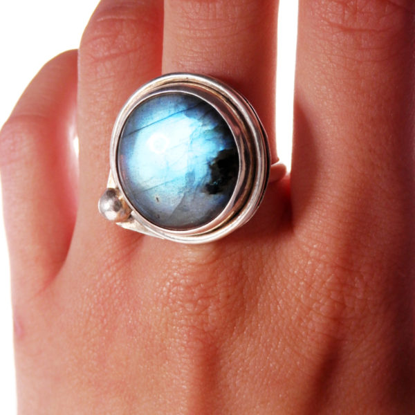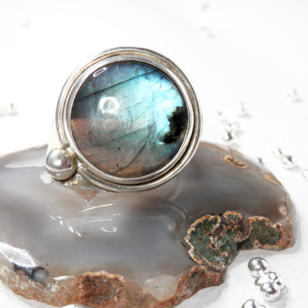 Bague ajustable en Argent massif texturé sertie d’une Labradorite violette.