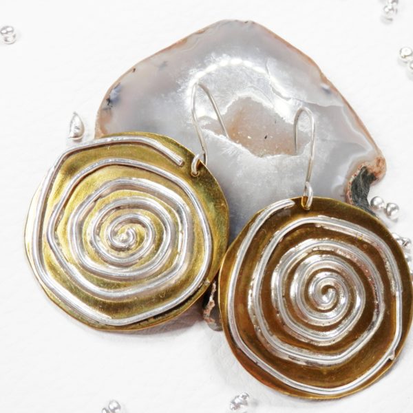 Boucles d’oreilles spirales style afro design, laiton et argent massif