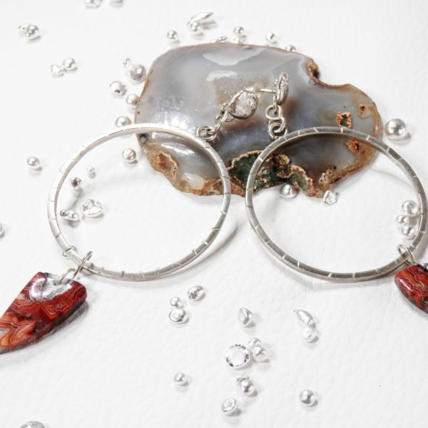 Boucles d’oreilles en forme de cercle en argent massif avec des agates crazy lace.