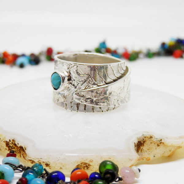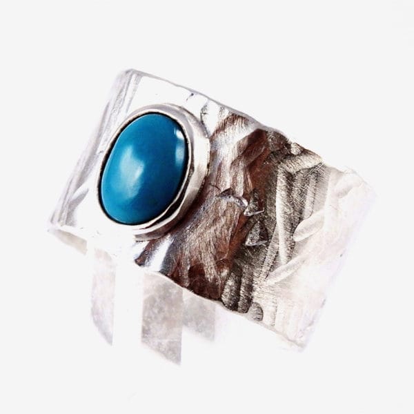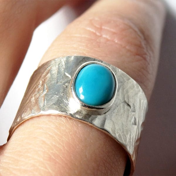 Superbe turquoise d’Arizona, naturelle, d’un bleu turquoise profond et pur, montée sur un anneau large martelé pour un effet original et design à la fois