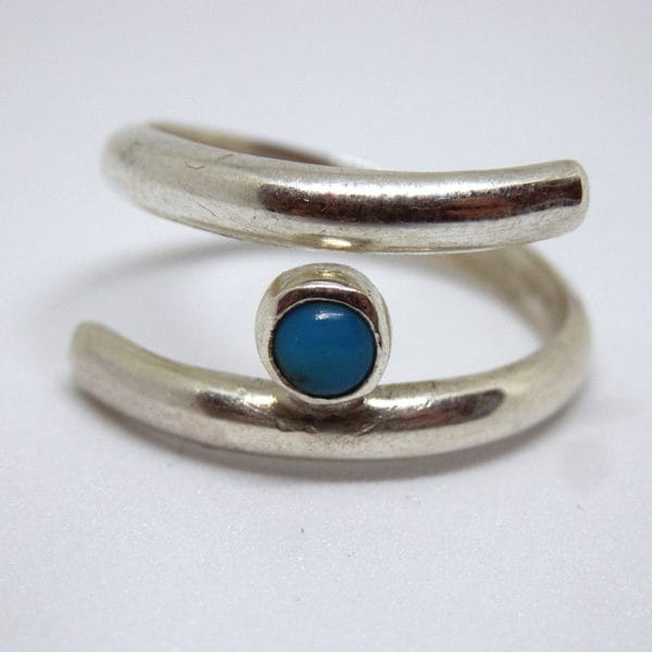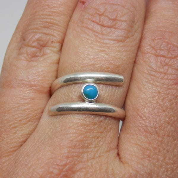Une très belle bague fine lumineuse avec sa pierre d’un turquoise profond. La forme ouverte laisse un effet léger sur le doigt pour une bague design, originale, élégante et confortable.